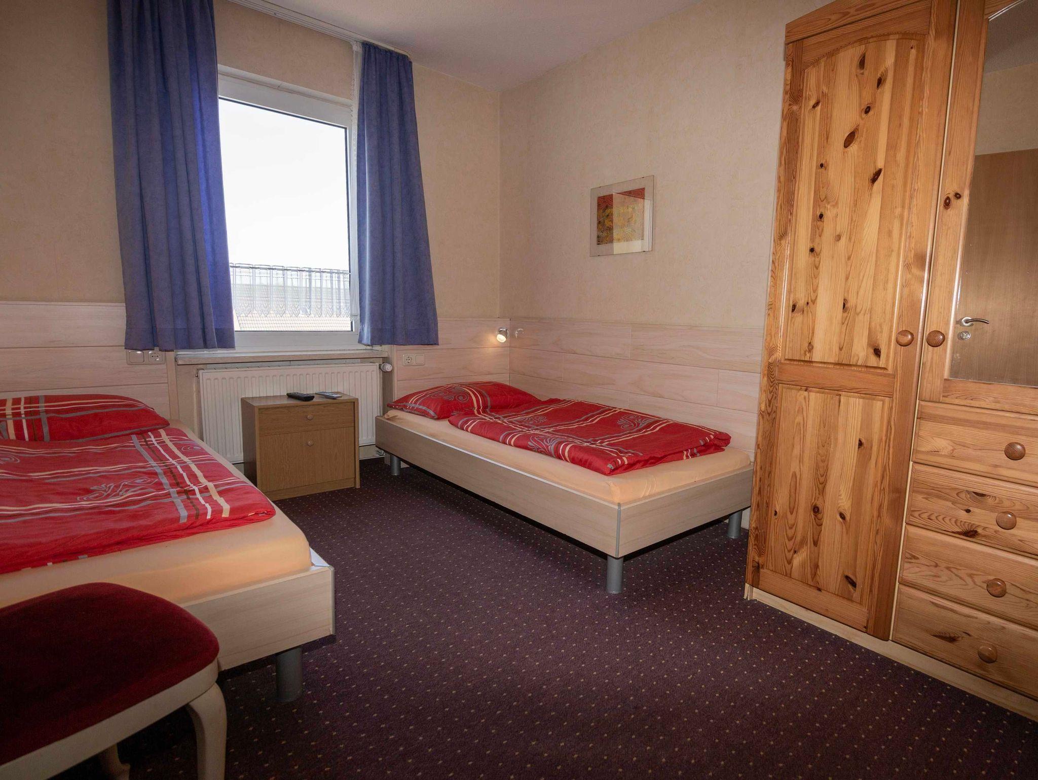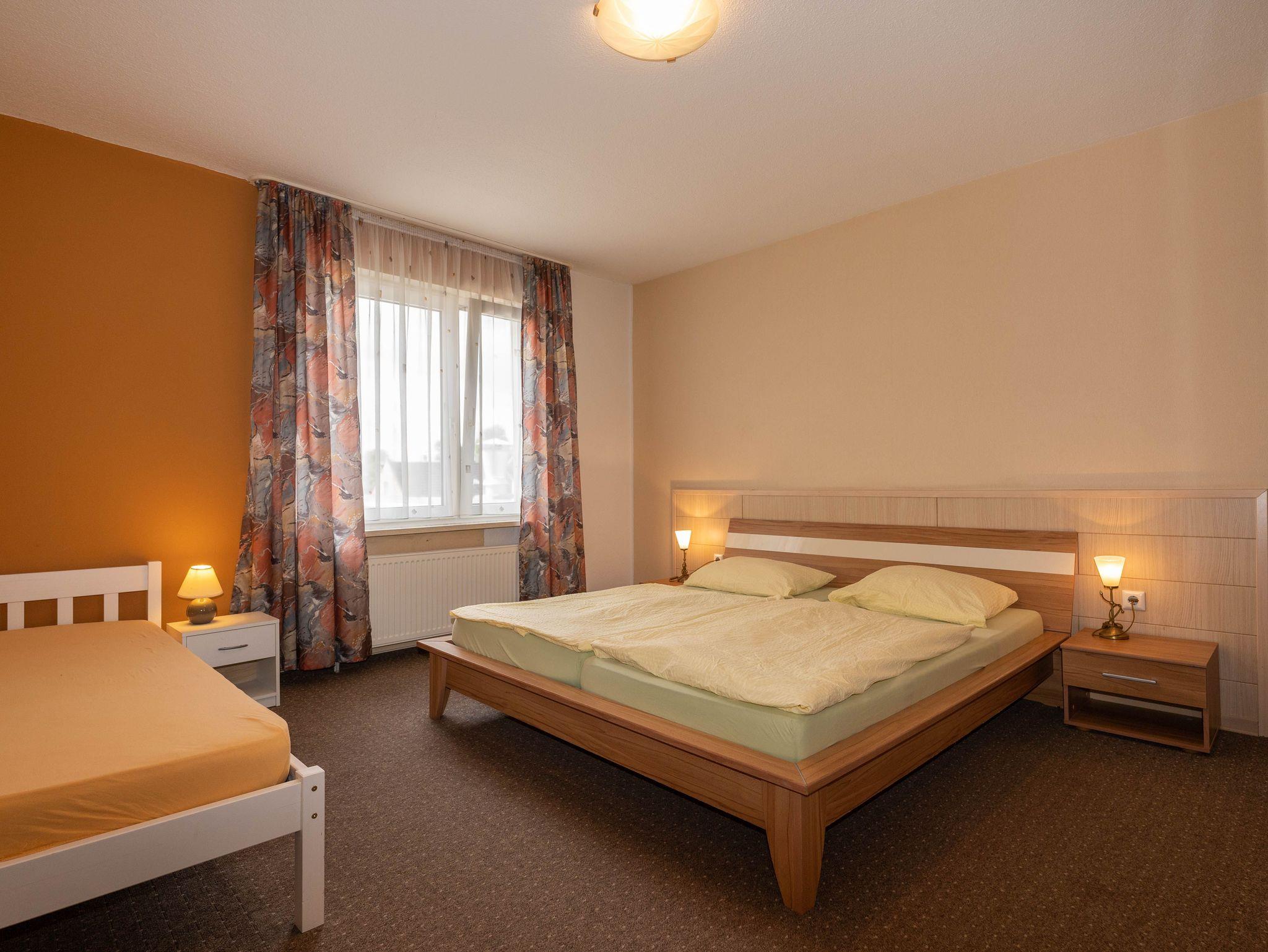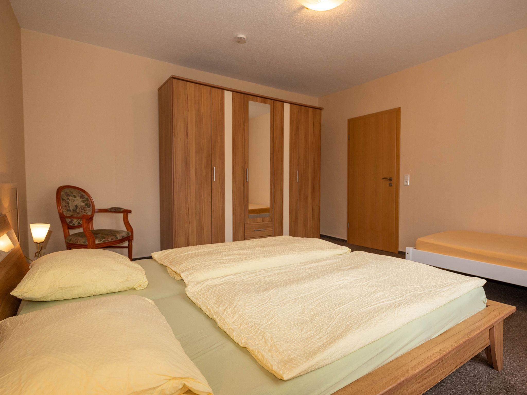 Die Wohnung besteht aus einem Wohnzimmer mit Einzelbett, zwei Schlafzimmerm , einer Küche und einem Bad mit Dusche.