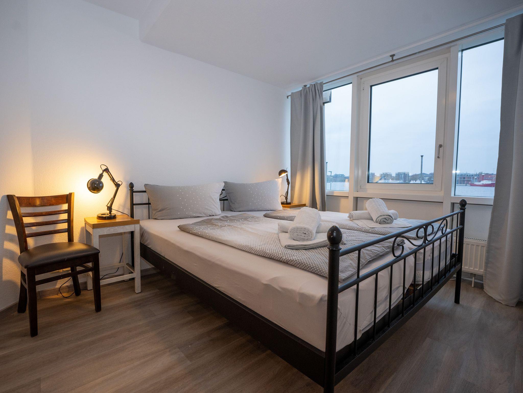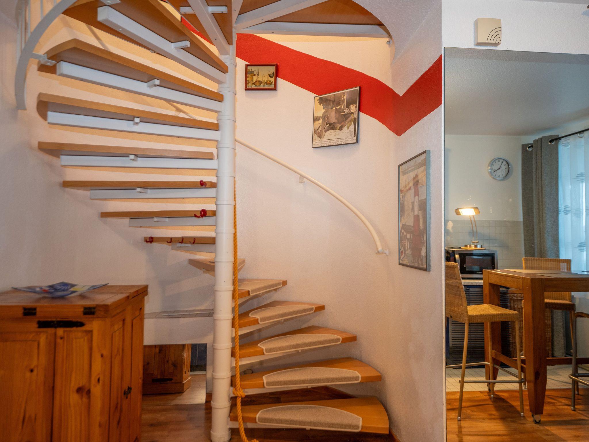 Im Erdgeschoß befindet sich der offene Wohn-/Eßbereich, ein Bad mit Dusche, die überdachte Terasse, mit Blick auf den maritimen Yachthafen und direkten Zugang zum Südstrand. Im 1. Obergeschoß befinden sich zwei Schlafzimmer. Das größere ist mit einem Doppelbett ausgestattet, das kleinere mit einem hochwertigem Schlafsofa. Beide Zimmer mit Blick auf den Binnenhafen. Hier befindet sich ebenfalls das zweite Bad mit Badewanne. Die Wohnung verfügt über einen eigenen PKW-Stellplatz. WLAN sowie ein urgemütlicher Strandkorb auf der Terrasse gehören ebenfalls zur hochwertigen Ausstattung dieser Ferienwohnung.