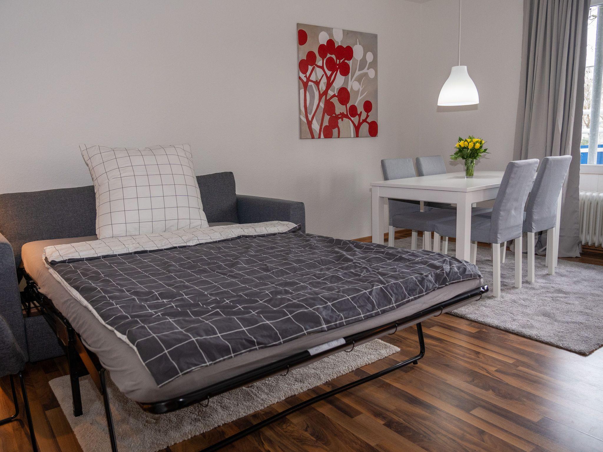 Die 60 qm große Wohnung befindet sich im Erdgeschoß des beliebten blau-weißen Hochhauses, eine Eigentümerwohnanlage, welche am Valoisplatz gelegen ist. Die Wohnung ist ausgelegt für maximal vier Personen.