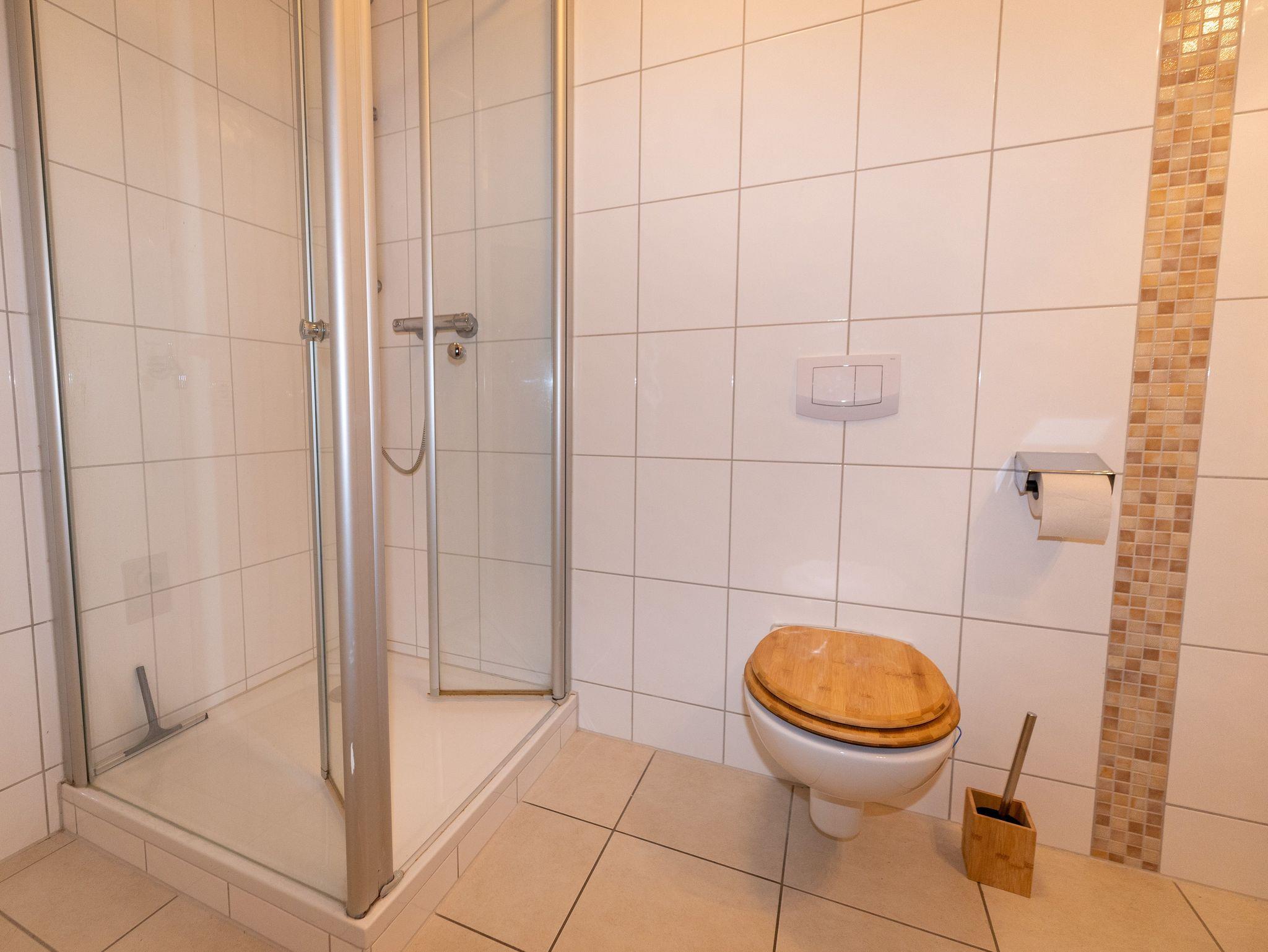 Im Bad sind neben dem WC und dem Waschbecken eine Dusche und ein Fön zu finden.