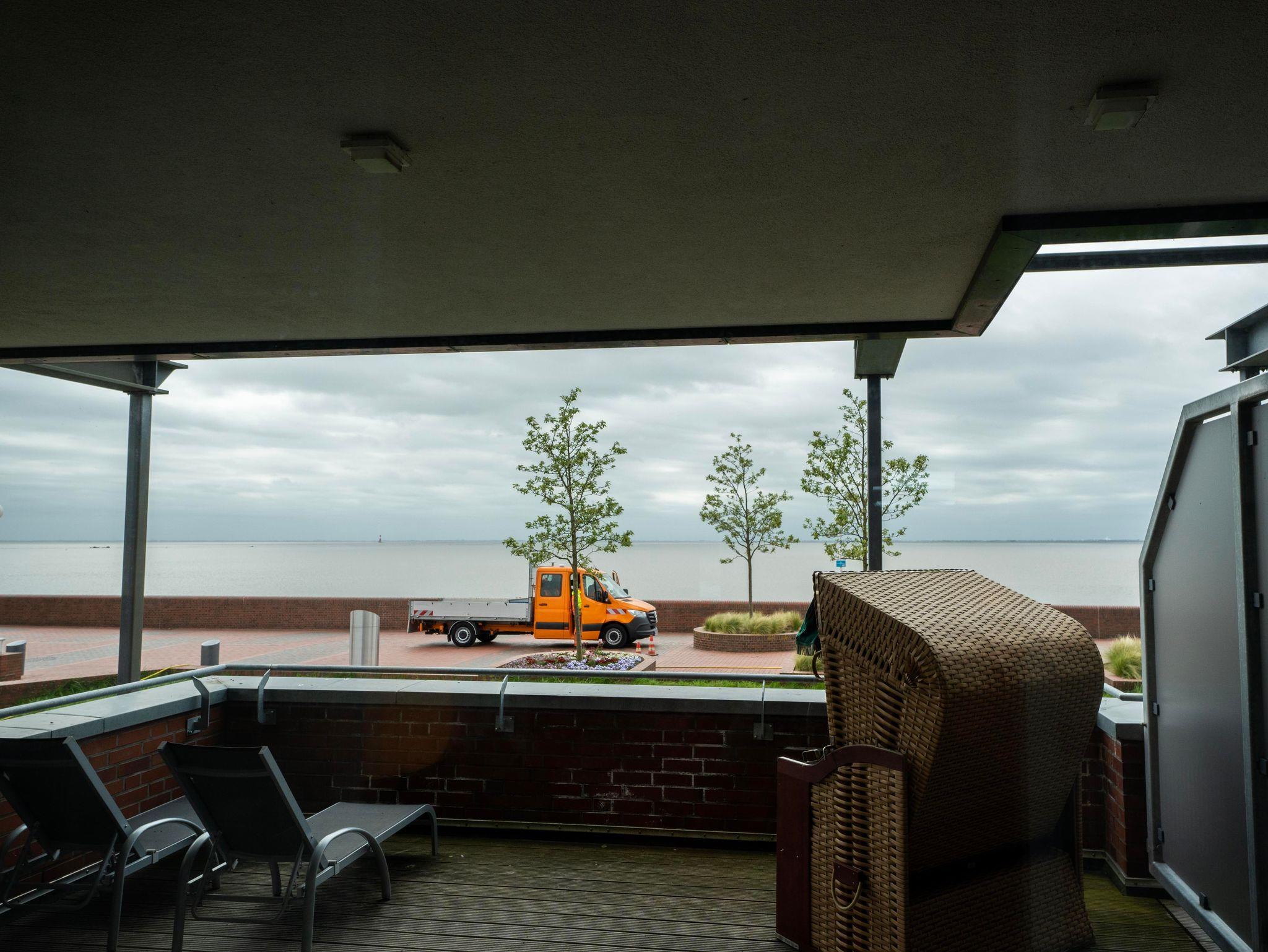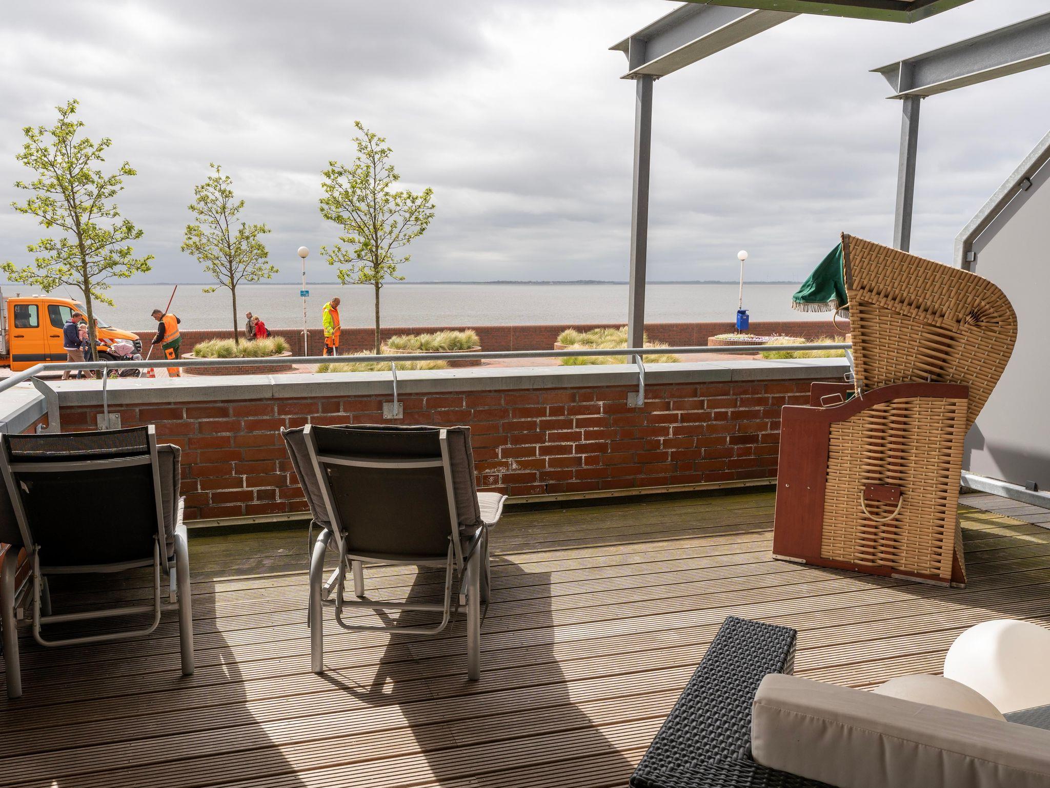 Der 40 qm große Süd-Balkon gibt reichlich Platz zum Verweilen in frischer Meeresluft mit Blick auf die abwechslungsreiche Wattenmeerlandschaft. Genießen Sie vom Wohnzimmer und Schlafzimmer aus den weiten Blick über´ die Nordsee. Eine moderne Sitzlounge, ein Strandkorb und zwei Liegen laden zum Verweilen ein.