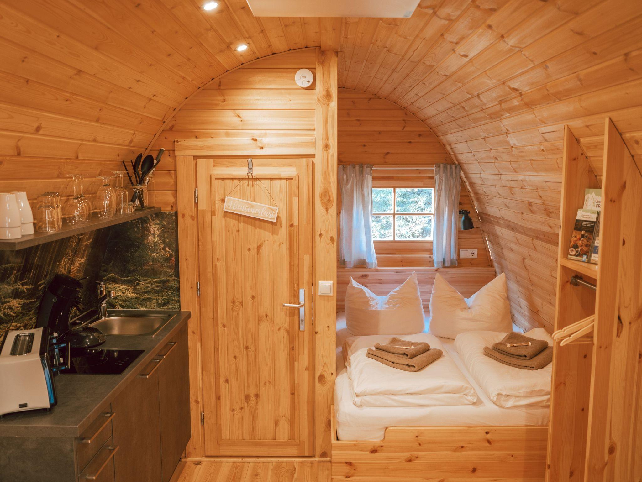 Geschmackvoll, natürlich in Holz gehalten und mit allem Komfort ausgestattet wird das Chalet in traumhafter Lage modernen Ansprüchen an komfortablen Wohnen gerecht. Das Naturhäuschen verfügt über einen Wohn- und Essbereich mit Kochgelegenheit, Bad mit Dusche und WC, einem Queensize Bett und einem Schlafsofa. Auf der Terrasse können Sie die Freiheit der Natur genießen. Außerdem verfügt das Deluxe Chalet über einen eigenen Hot Tub der für die alleinige Nutzung bereit steht. Zusätzlich stellen wir ihnen Bademäntel und Badeschuhe zur Verfügung.