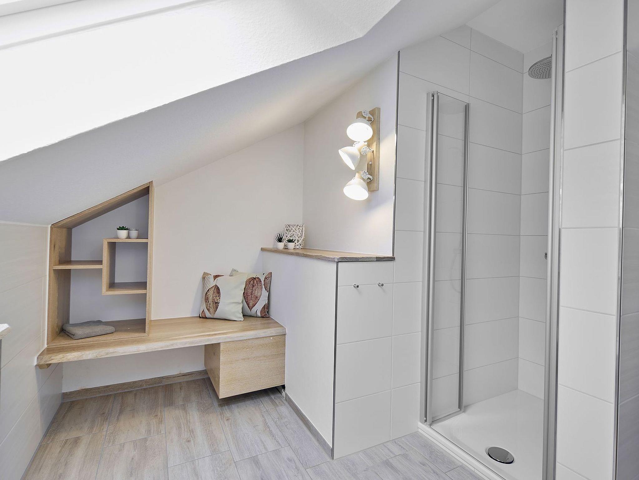 Des Weiteren verfügt die Ferienwohnung über ein Schlafzimmer mit einem Doppelbett und einem Einzelbett sowie einem Badezimmer mit Dusche. Ein Föhn liegt natürlich schon für Sie bereit.