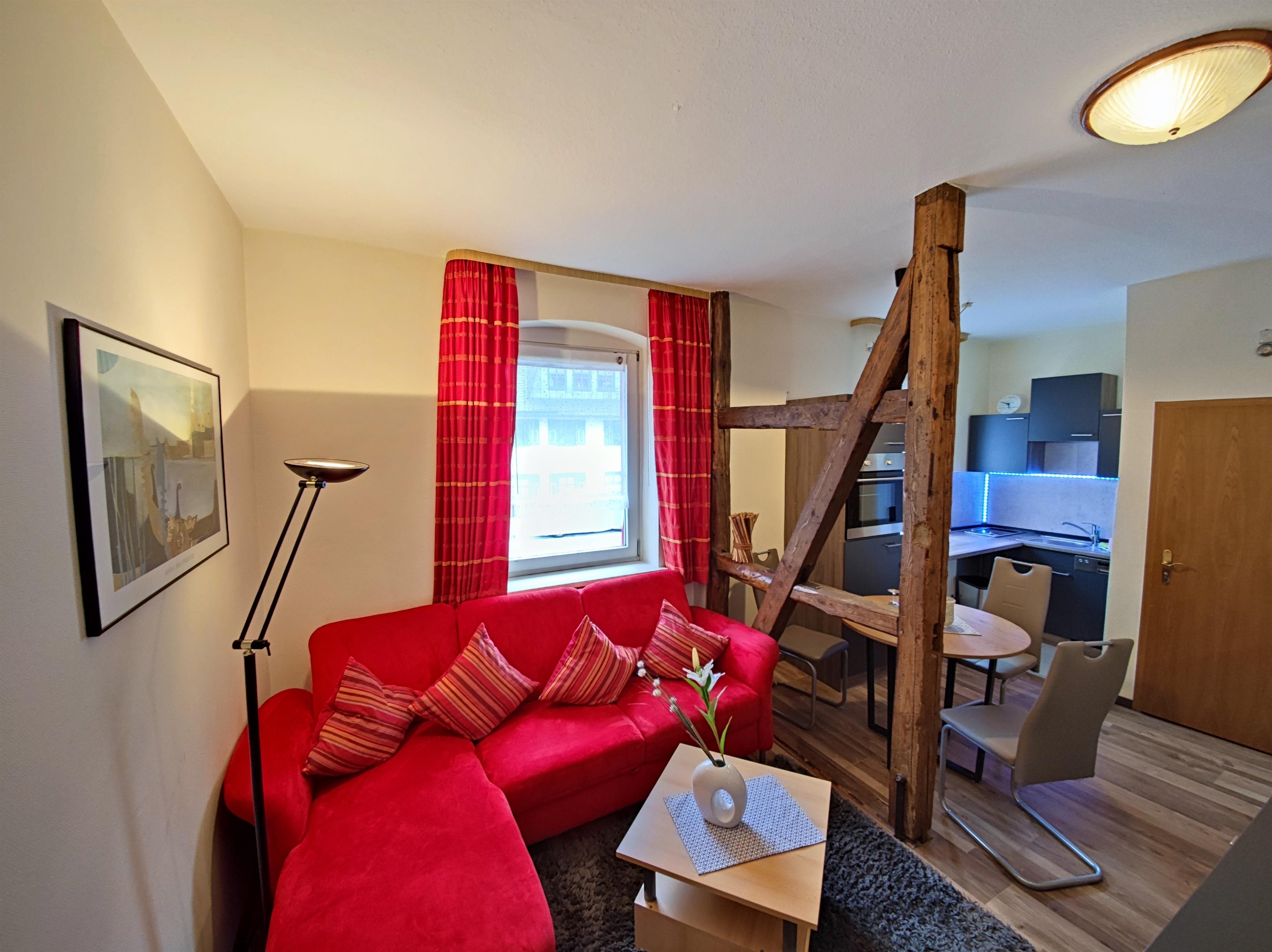 Das Apartment befindet sich im 1. Stock und bietet Ihnen auf ca. 38 m² ein Schlafzimmer mit Boxspringbett, ein Wohnzimmer mit gemütlicher Sitzecke und Sat-TV sowie ein Bad mit Dusche/WC,Haarfön, Kosmetikspiegel und Pflegeprodukten.