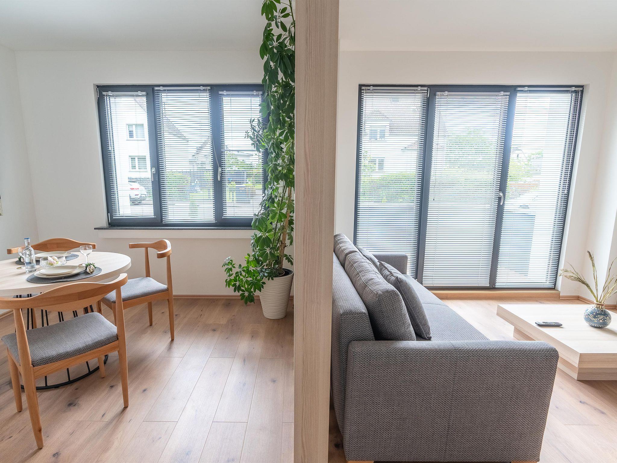 Ein besonderes Highlight ist die Raumtrennung, die den Ess- und Wohnbereich angenehm voneinander abgrenzt und für zusätzliche Gemütlichkeit sorgt. Die Terrasse lädt zum Entspannen im Freien ein. Frische Handtücher, Bettwäsche und kostenfreie Parkplätze sind inklusive. In der voll ausgestatteten Küche finden Sie alles, was Sie benötigen. Mikrowellen und Backöfen können ausgeliehen werden, Waschmaschine und Trockner stehen gegen Aufpreis zur Verfügung.