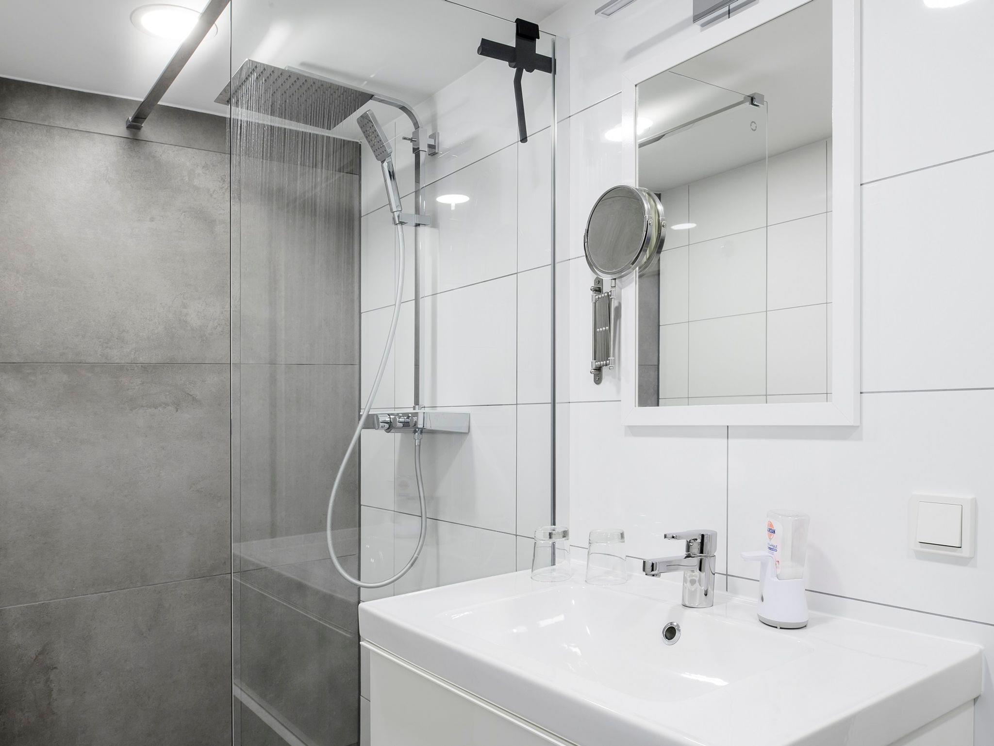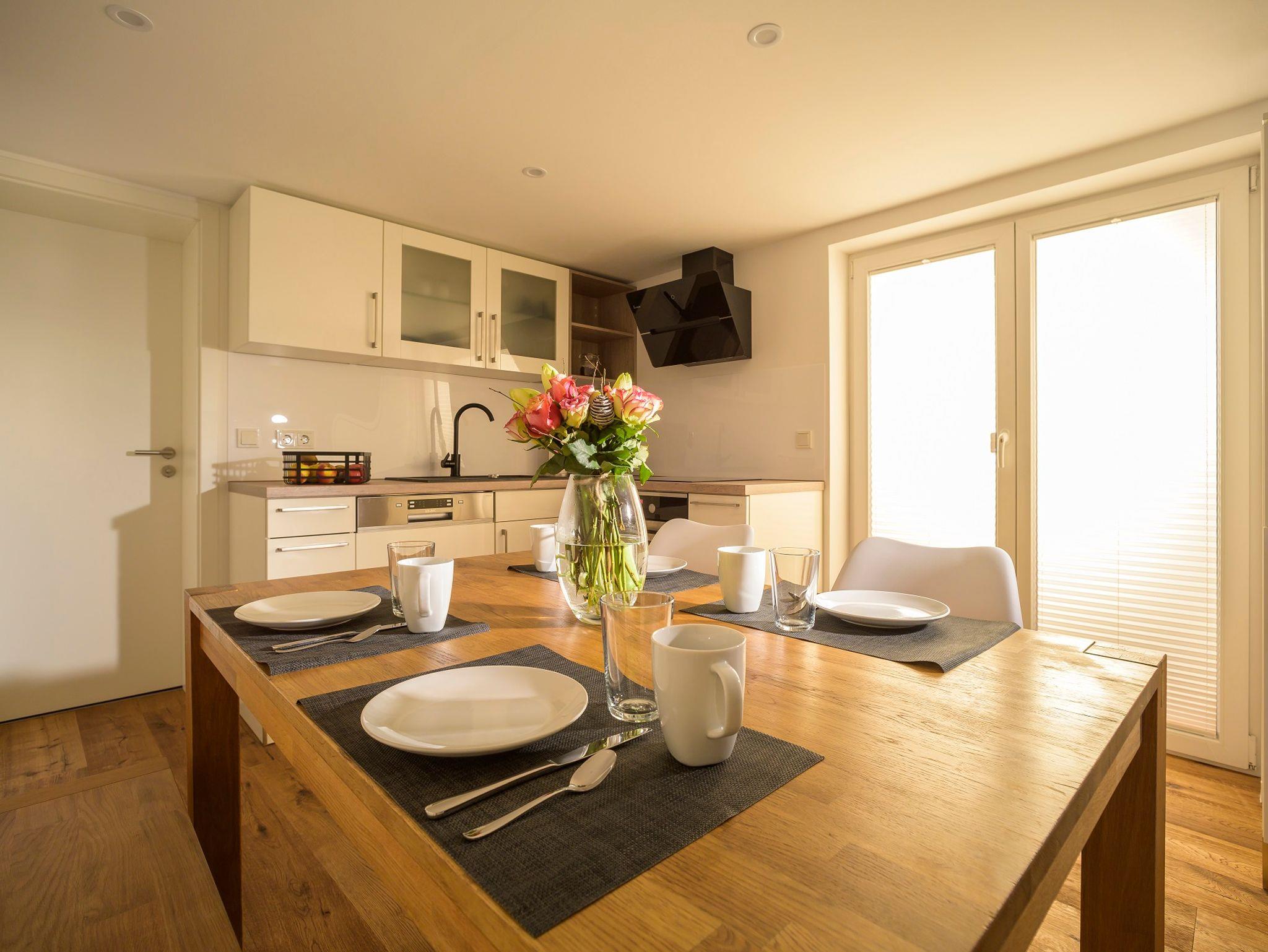 In der Wohnung stehen Ihnen eine vollausgestattete Küche mit einem geräumigen Essbereich, ein gemütlicher Wohnbereich mit SAT-TV, Blu-ray Player und Stereoanlage, ein Schlafzimmer mit Queen-Size Bett, ein weiteres Schlafzimmer mit einem ausziehbarem Alkovenbett sowie ein modernes Bad mit bodengleicher Regendusche, Föhn und Kosmetikspiegel zur Verfügung.