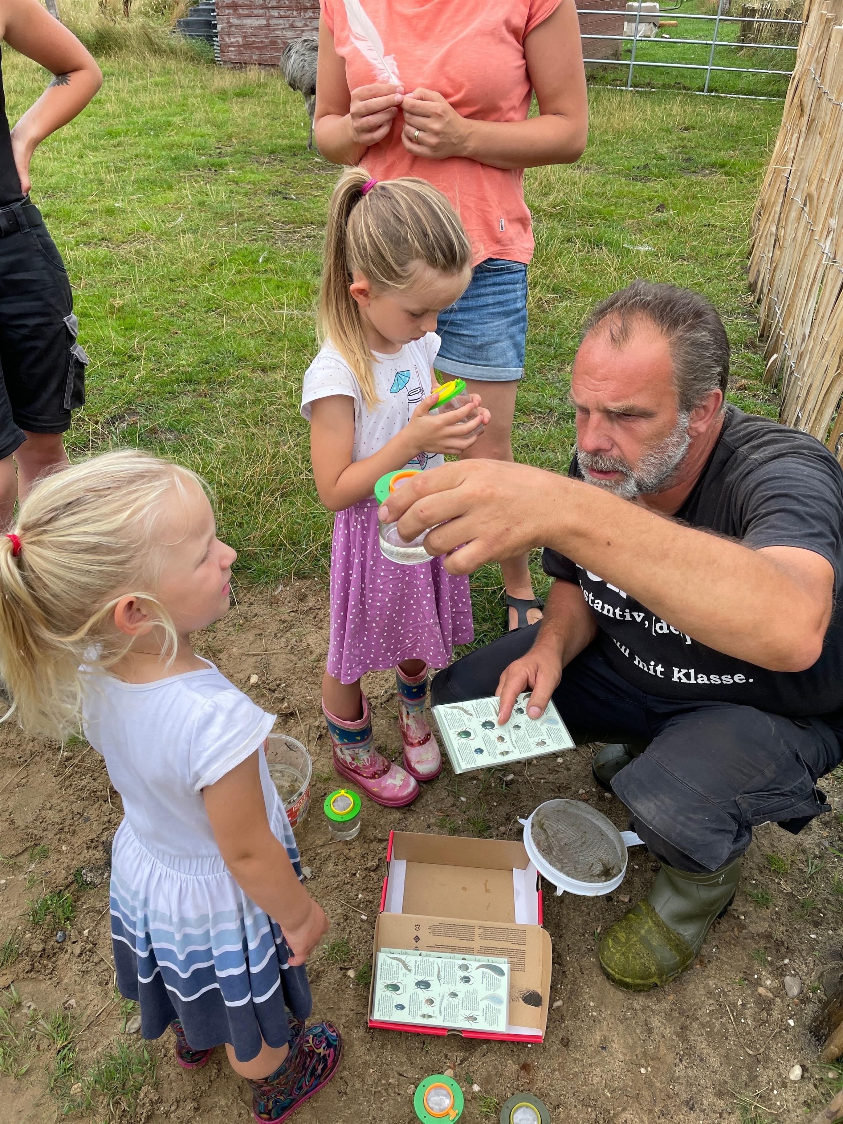 Auf unserer Streuobstwiese tummeln sich viele Insekten und auch die Bienen von unserem Imker schwirren bei ihren Bienenstöcken umher. Mit Becherlupen und Bestimmungskarten, die Ihr bei uns ausleihen könnt, lassen sich viele spannende Tierchen entdecken und beobachten. Fragt einfach nach!