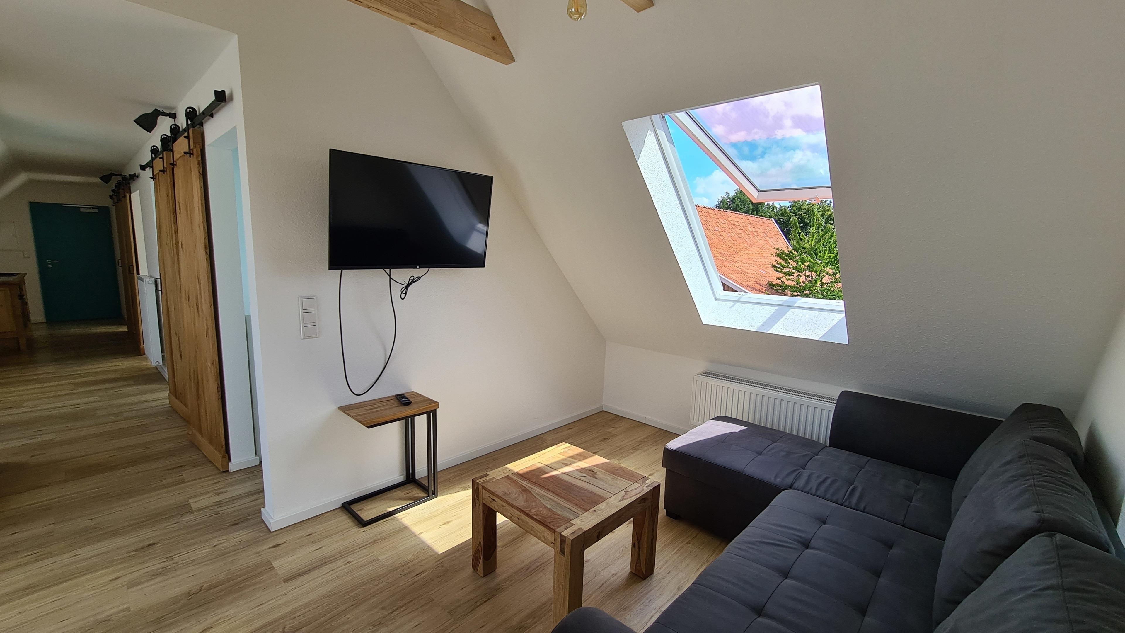 Die Küche ist im extra breiten Flur untergebracht, der in einem gemütlichen Wohn- und Essbereich mit Flachbild-TV endet, in dem ihr gemütlich am Balkonfenster sitzen und den ganzen hintere Hofbereich bewundern könnt. Für die ganz Kleinen steht ein Kinderstuhl bereit.