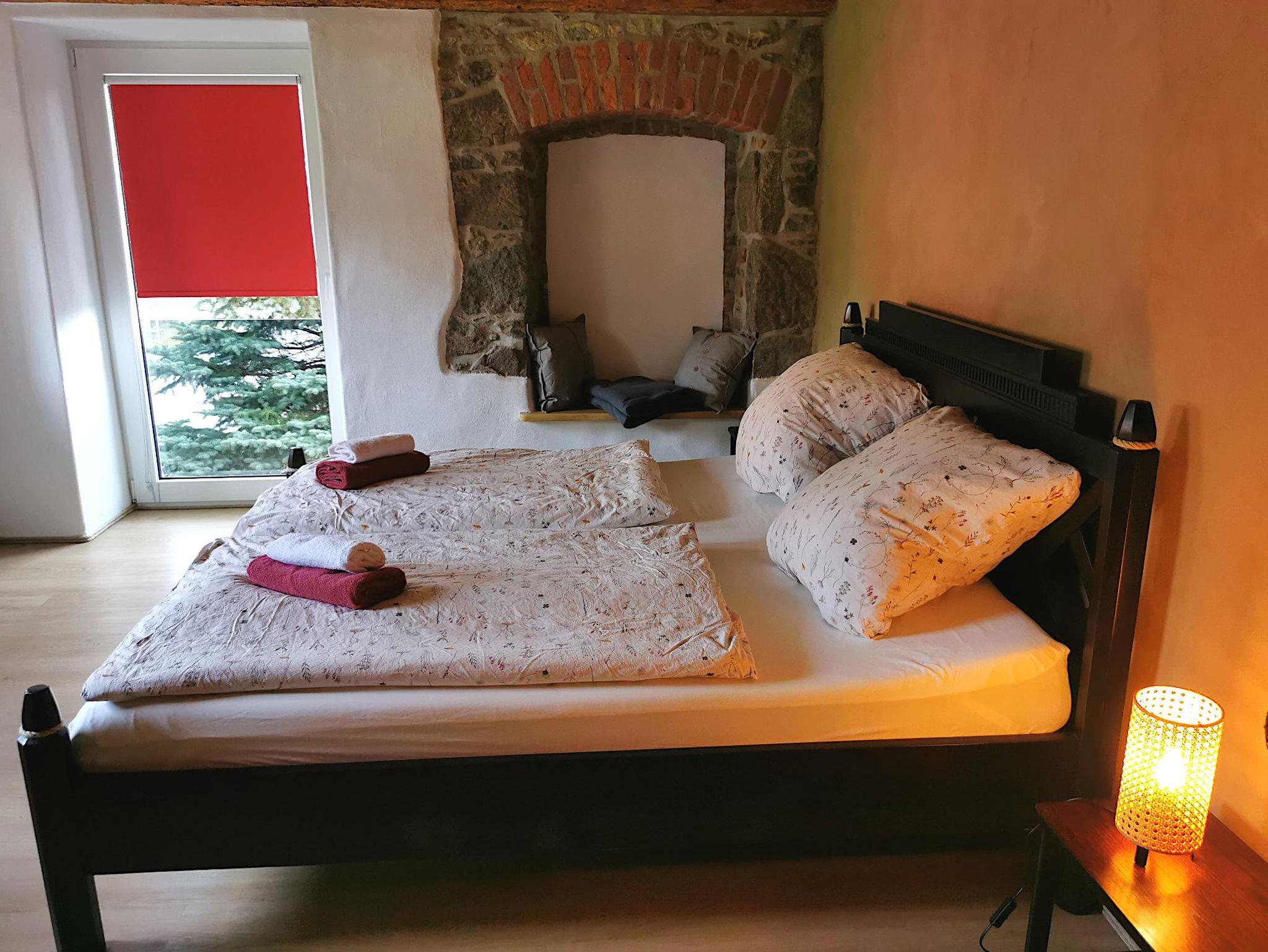 Laubegast ist ein 19 qm großes, liebevoll saniertes und eingerichtetes Doppelzimmer im Obergeschoss. Es verfügt über einen Laminatfußboden mit Fußbodenheizung sowie ein großes Fenster mit französischem Balkon. Laubegast ist mit einem Doppelbett (180cm x 200cm), einer Kommode, einem Spiegel und einer Sitzgelegenheit ausgestattet. Jeweils ein Bad mit WC und Dusche im Ober- und Erdgeschoss sowie ein 30 m² großer Aufenthaltsraum mit einem gemütlichen Sofa und Flachbildfernseher mit Magenta TV und WLAN und einer voll ausgestatteten Wohnküche im Erdgeschoss sind zur gemeinschaftlichen Nutzung der Feriengäste vorgesehen. Ein eigener Kühlschrank für mitgebrachte Lebensmittel und Getränke steht für die Gäste von Laubegast in der Wohnküche bereit. Die Dachterrasse nebenan lädt insbesondere an sonnigen Tagen zum Verweilen und Sonnetanken ein.