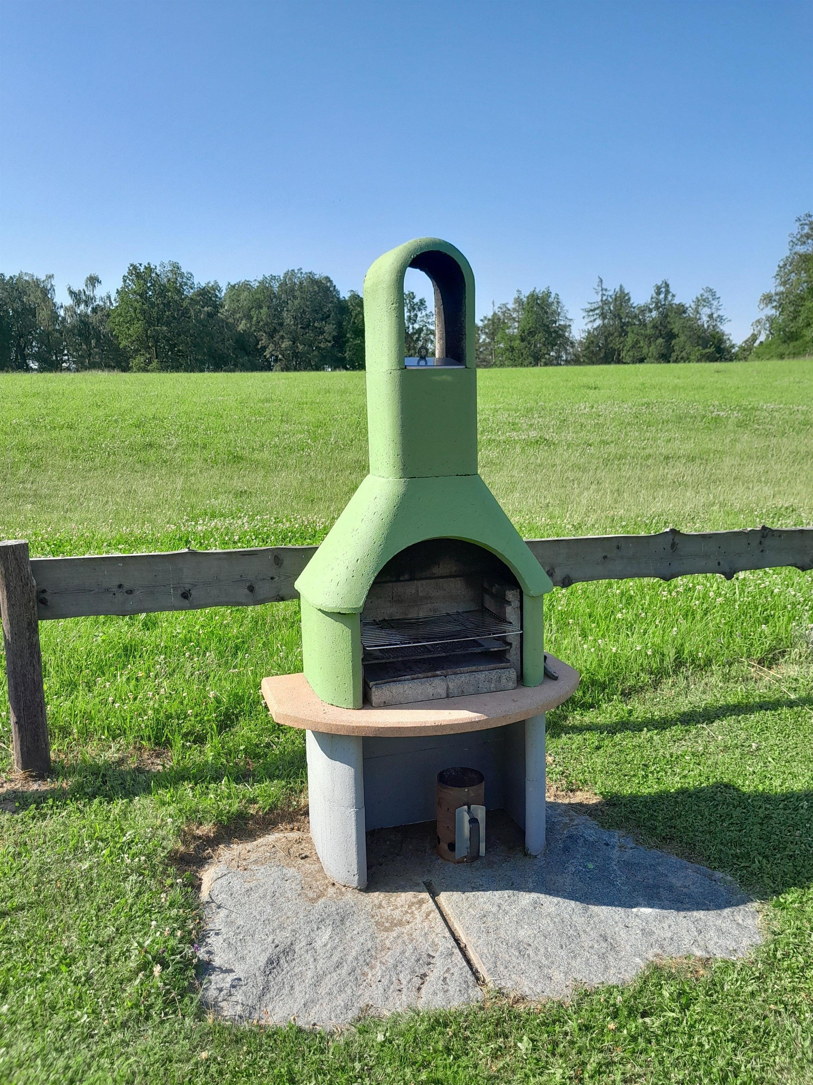 Im Aussenbereich befindet sich die Terasse mit Natursteintisch,-fliesen,Sonnenschirm und festem Grill,umgeben von einer Wiese am Waldrand und einem großen Spielehaus mit Sandkasten für Kinder.