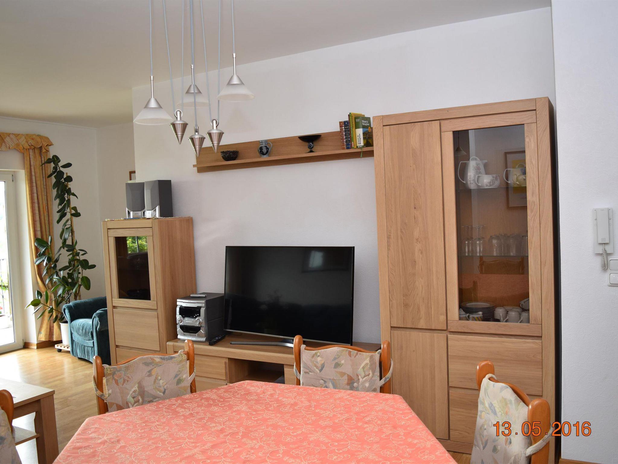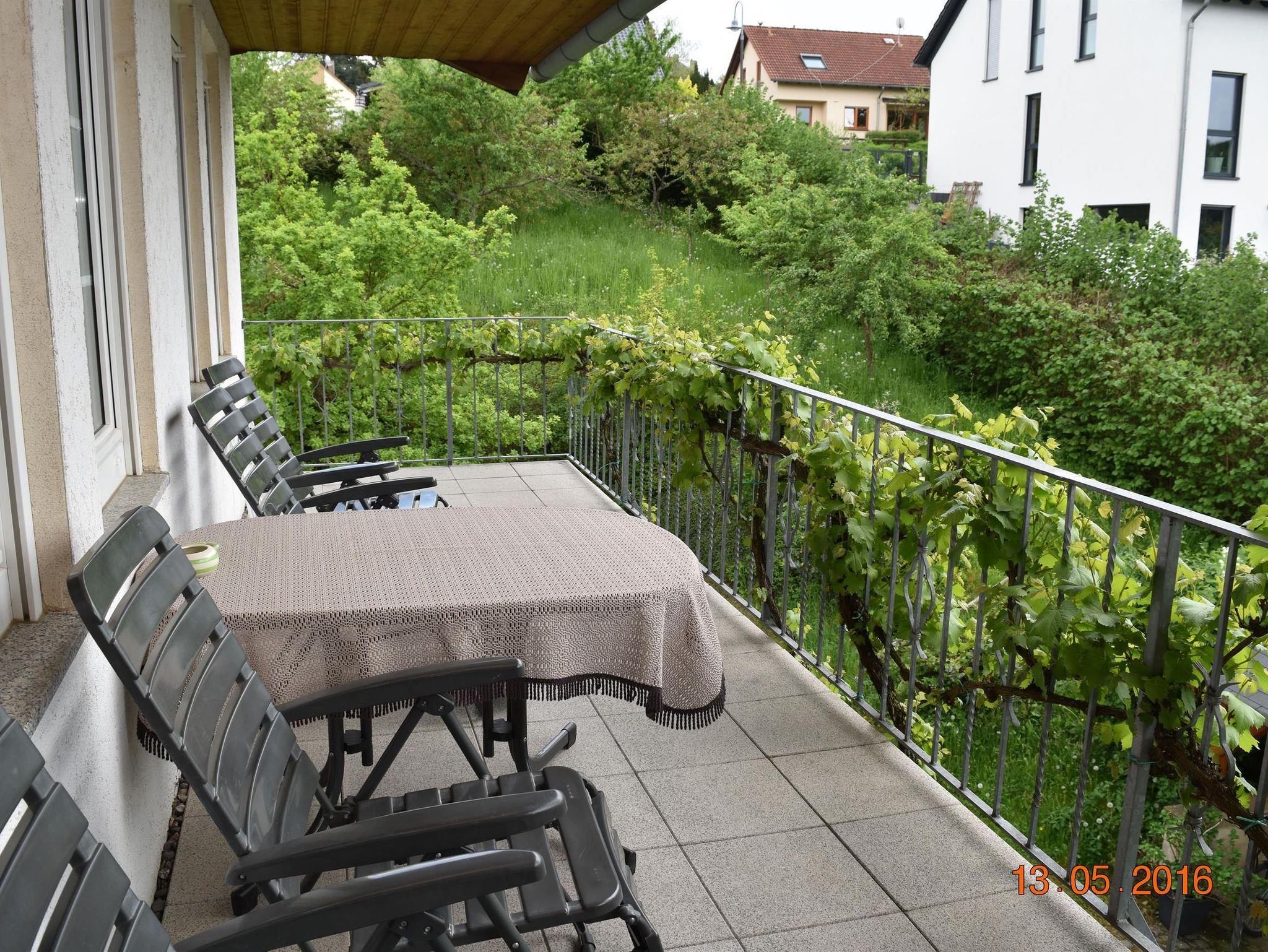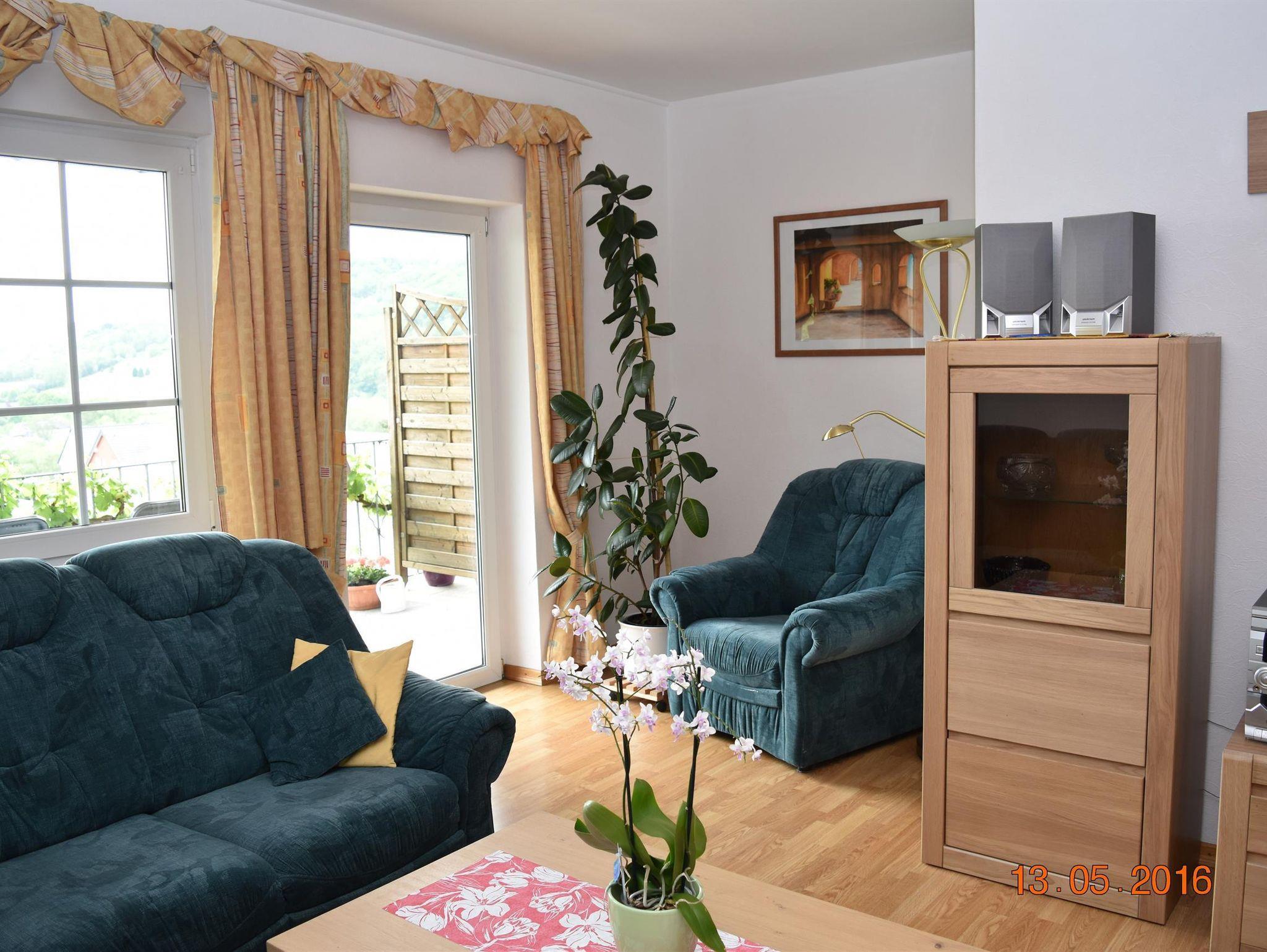 Ferienwohnung Schöne Aussicht: Wohnfläche: ca. 63 qm auf der 1. Etage und mit herrlichem Blick über das Saartal, 2 Schlafzimmer mit separaten Badezimmern (1 x DZ und 1 x Zimmer mit Einzelbetten), komplett eingerichtete abgetrennte Küche, geräumiges Wohn-/Esszimmer mit gemütlicher Sofaecke und großem Flachbild-TV, möblierter Balkon