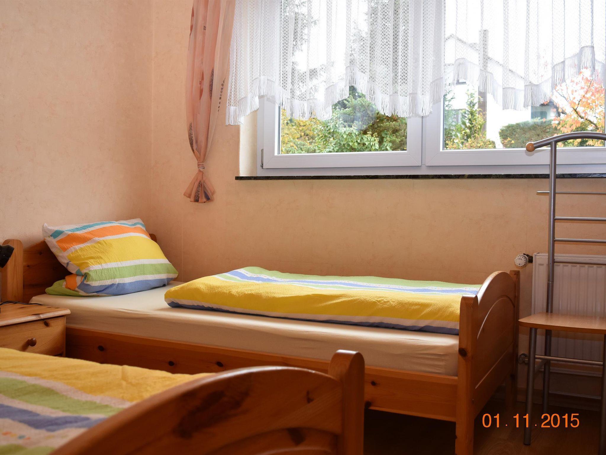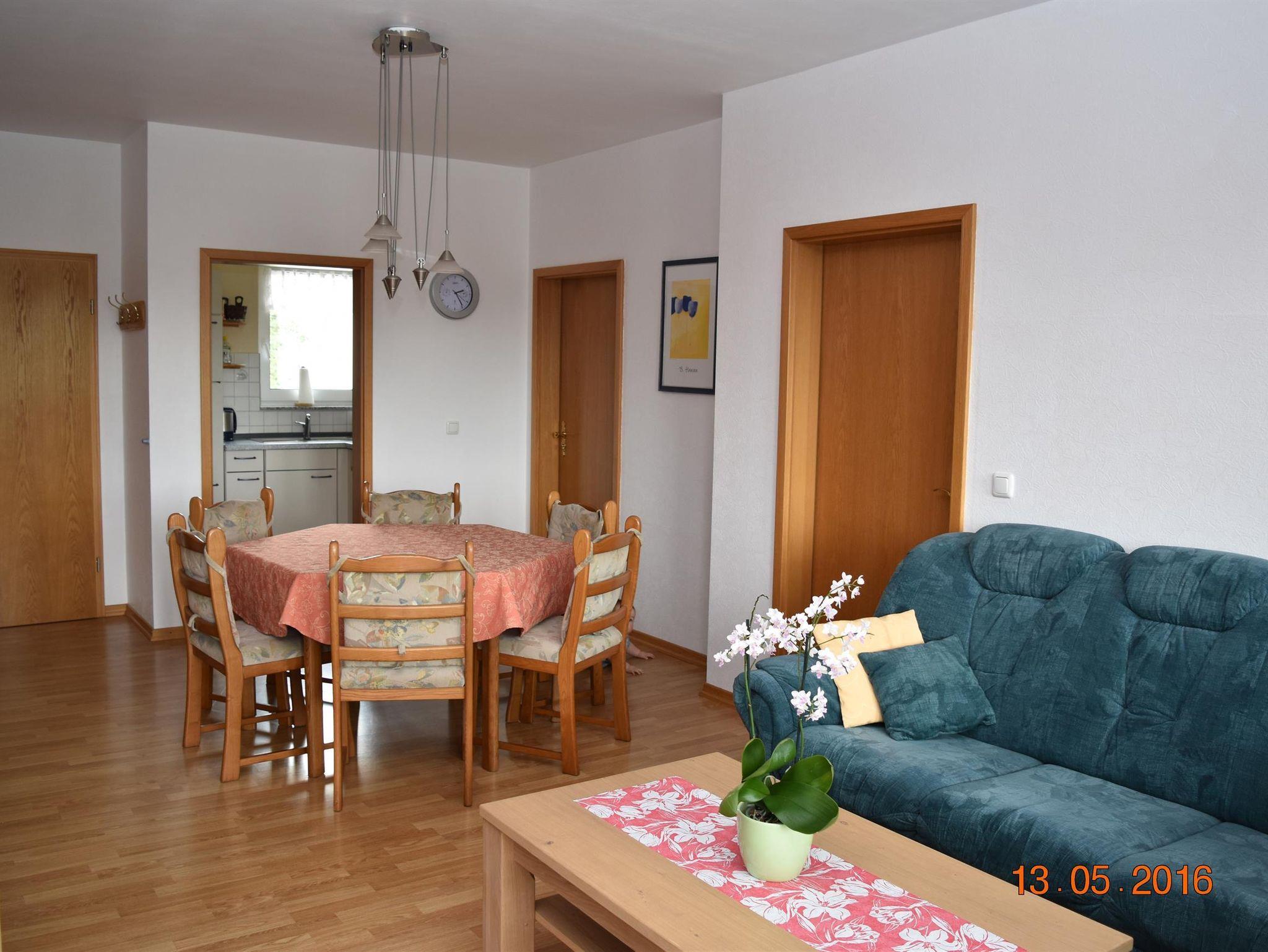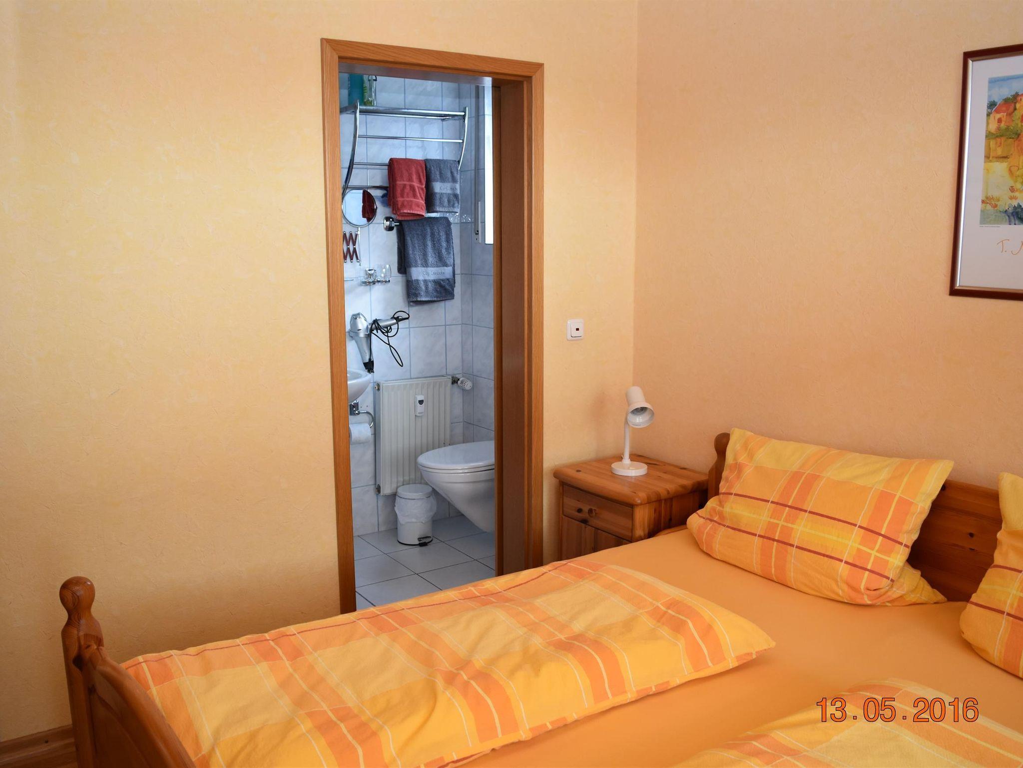 Ferienwohnung Schöne Aussicht: Wohnfläche: ca. 63 qm auf der 1. Etage und mit herrlichem Blick über das Saartal, 2 Schlafzimmer mit separaten Badezimmern (1 x DZ und 1 x Zimmer mit Einzelbetten), komplett eingerichtete abgetrennte Küche, geräumiges Wohn-/Esszimmer mit gemütlicher Sofaecke und großem Flachbild-TV, möblierter Balkon