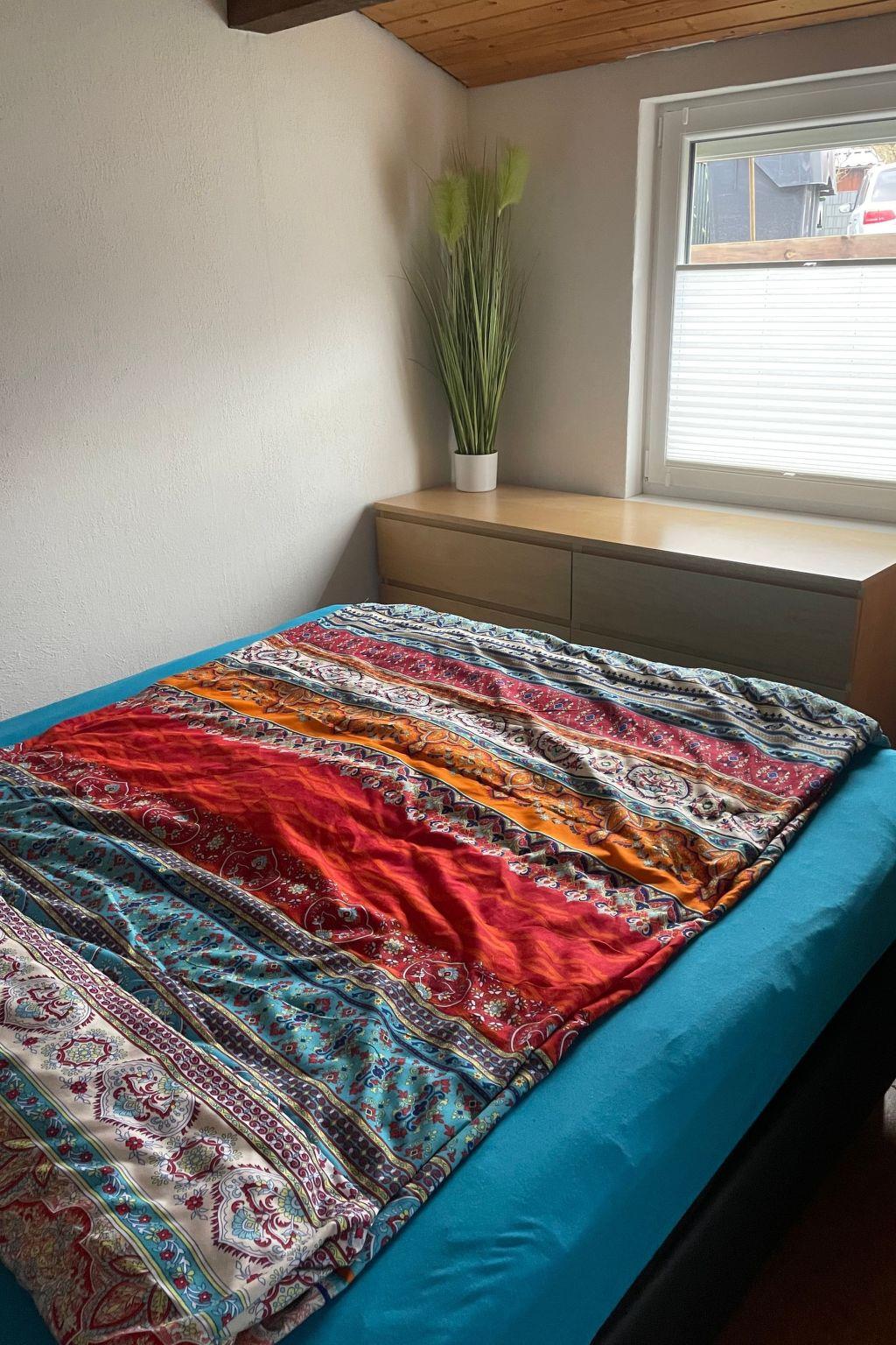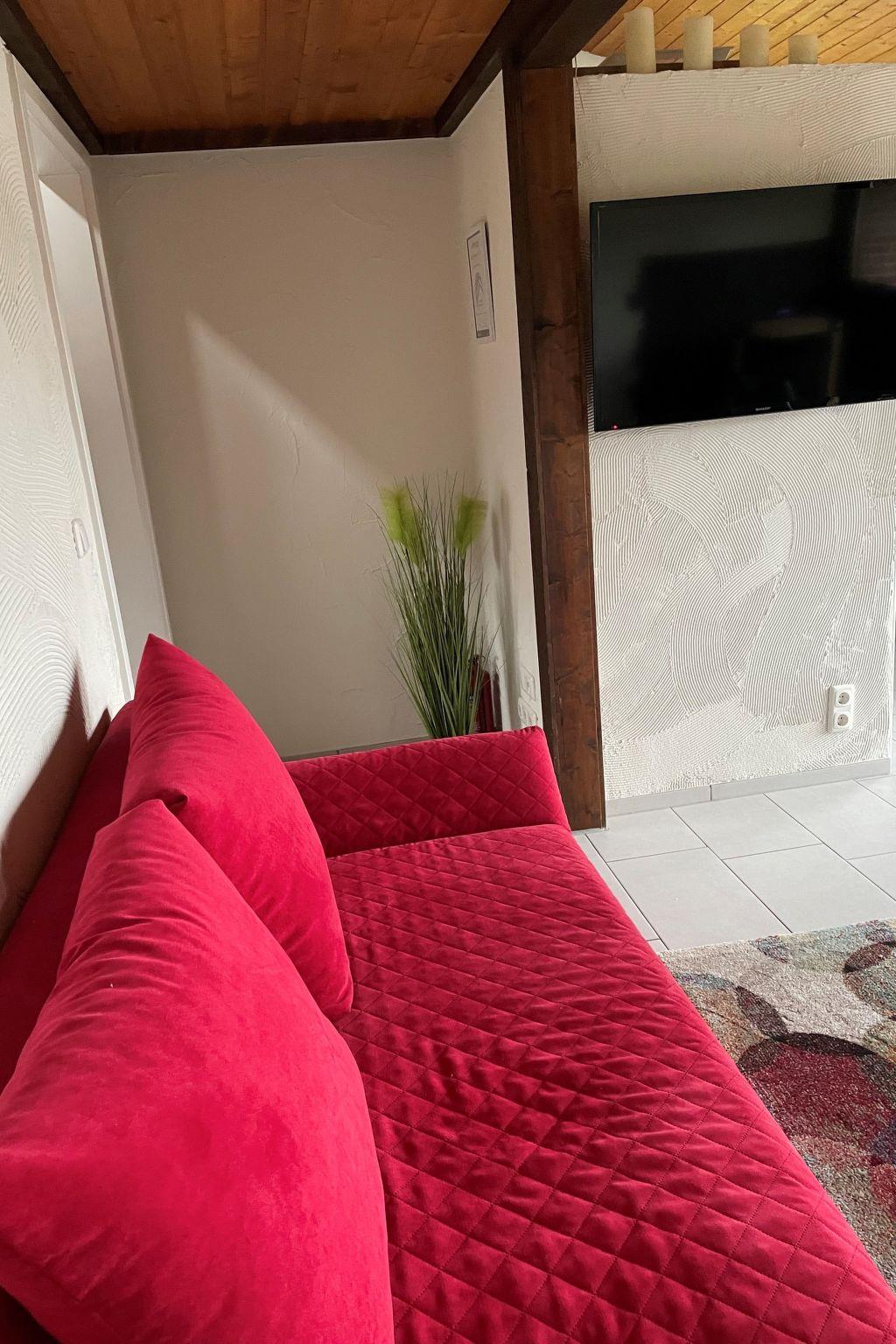 The fully equipped semi-detached house leaves nothing to be desired: The kitchen with integrated dining table has all technical appliances (oven, fridge, microwave, dishwasher, coffee machine, toaster, kettle) as well as a washing machine. In addition to the bedroom with king-size bed (1.60 x 2.00 m), there is another sleeping option on the sofa bed in the gallery, which can be reached via an integrated ladder. The gallery, which does not reach standing height, is nevertheless a fully usable space with a desk and chair by the window and shelves, and the living room, from which the whole house can be heated with a pellet stove, has two cosy sofas, one of which can be used as a sofa bed. The existing TV is equipped with a large flat screen and the bathroom with a large shower was renovated in 2016, as was the entire house.
