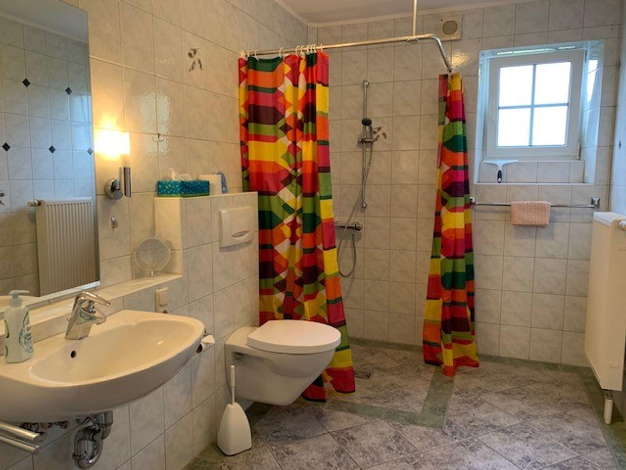 Die schöne Ferienwohnung Lavendel 60qm, Erdgeschoss und behindertengerecht (Schwellenfrei, mit 1m breiten Türen und großer, rollstuhlgerechter Dusche/WC). Sie verfügt über ein großes Schlafzimmer mit Doppelbett und einem Kinderzimmer mit Etagenbett.