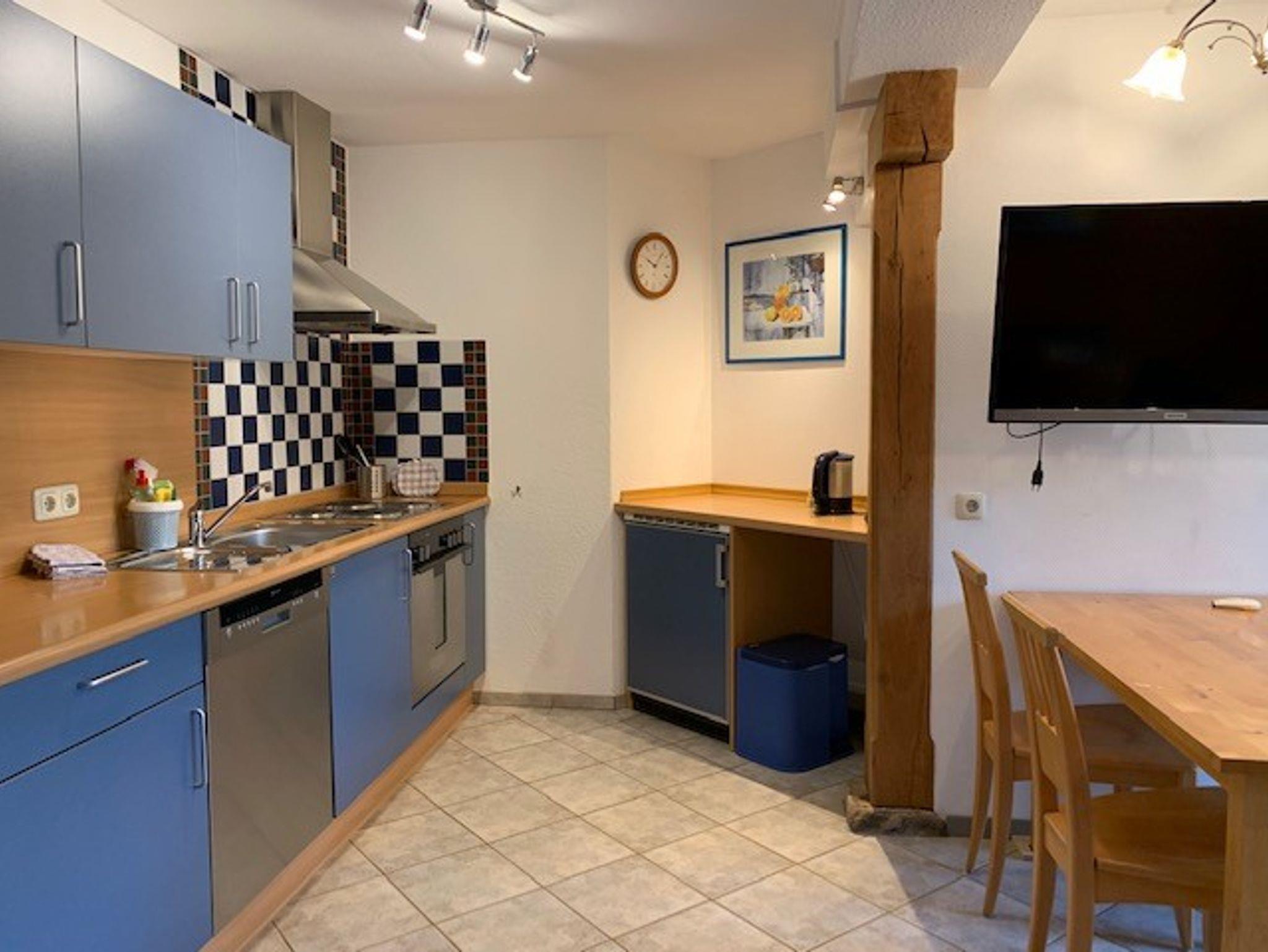 Der kombinierte Wohn- und Essraum. Das gemütliche Wohnzimmer mit Couch, einem kleinen Tisch mit zwei Stühlen, einem modernem SAT-TV sowie mit einem Esstisch ausgestattet. Die vollausgestattete, Küche mit Backofen, Herd, Geschirrspüler, Kühlschrank.Außerdem gehört zu der Ferienwohnung eine Süd-West Terrasse mit Blick in die freie Natur.