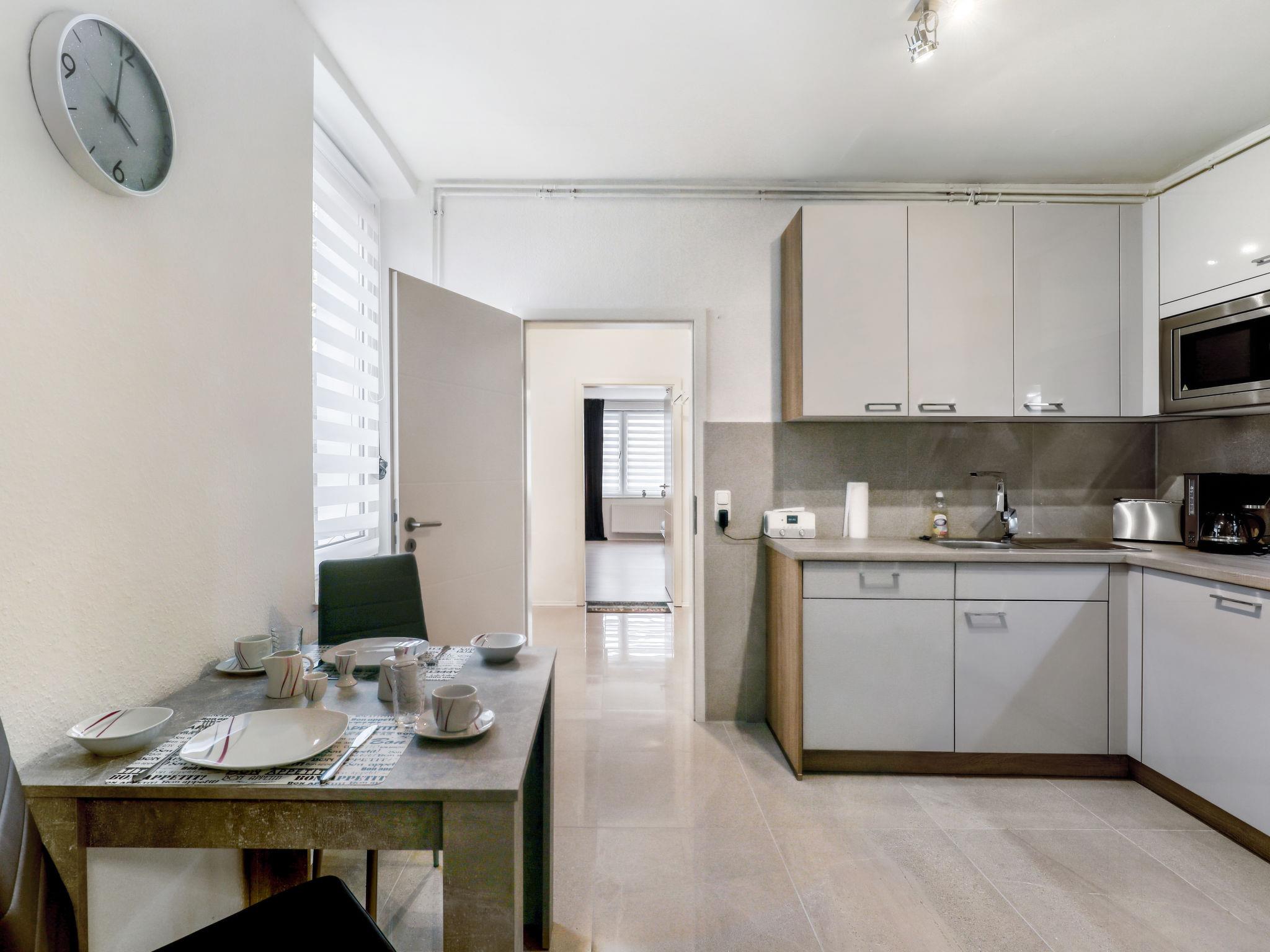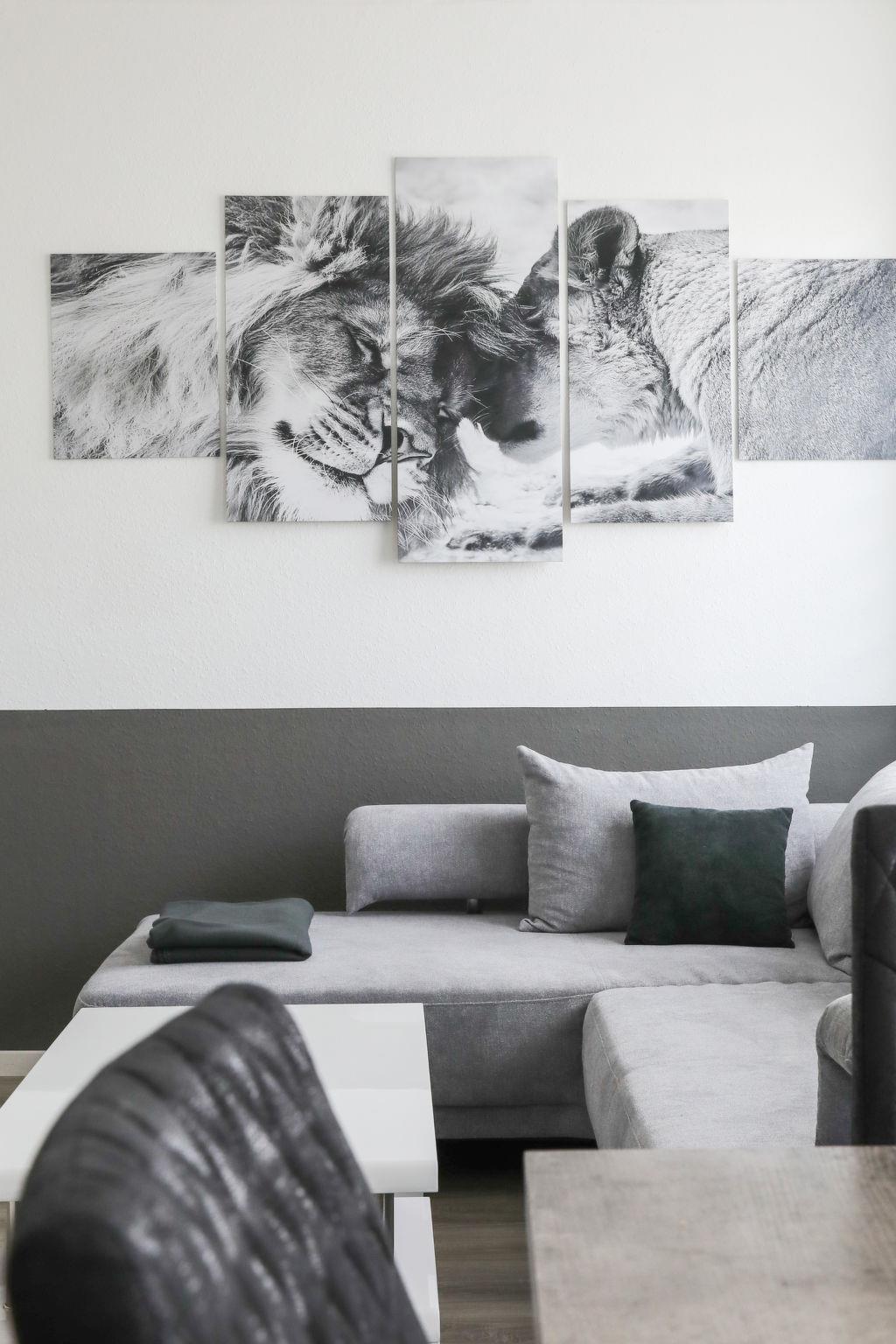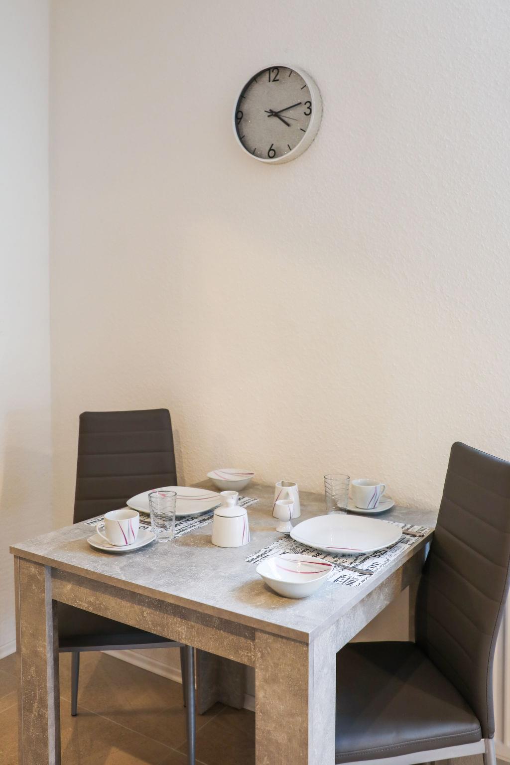 5-room apartment 145 m2, on the ground floor. Spacious, fully renovated in 2022, modern and stylish furnishings: open large living/dining room with dining table, cable TV and flat screen. Large living/sleeping room with 1 double sofabed, cable TV and flat screen. 1 room with 1 double bed (180 cm, length 200 cm). 1 room with 1 double bed (180 cm, length 200 cm), cable TV and flat screen. 1 room with 2 beds (90 cm, length 200 cm). Open kitchen (oven, dishwasher, 4 ceramic glass hob hotplates, toaster, kettle, microwave, electric coffee machine). 3 showers/WC. Heating. Facilities: Internet (WiFi, extra). Please note: non-smokers only. Smoke alarm. No internal connecting door between the separated properties. In addition, there is a second kitchen on the ground floor (oven, dishwasher, 4 ceramic hobs, toaster, microwave, electric coffee machine).