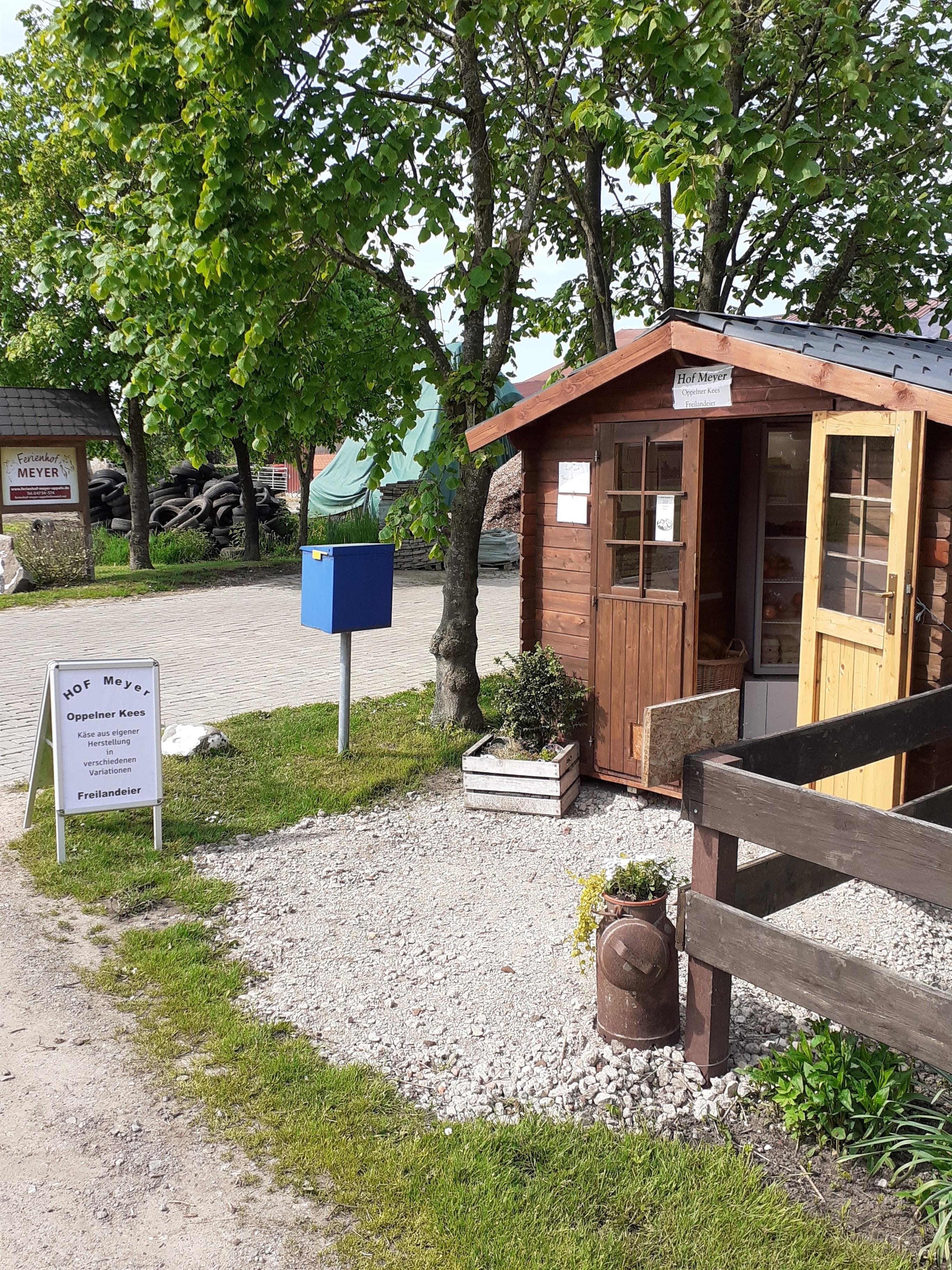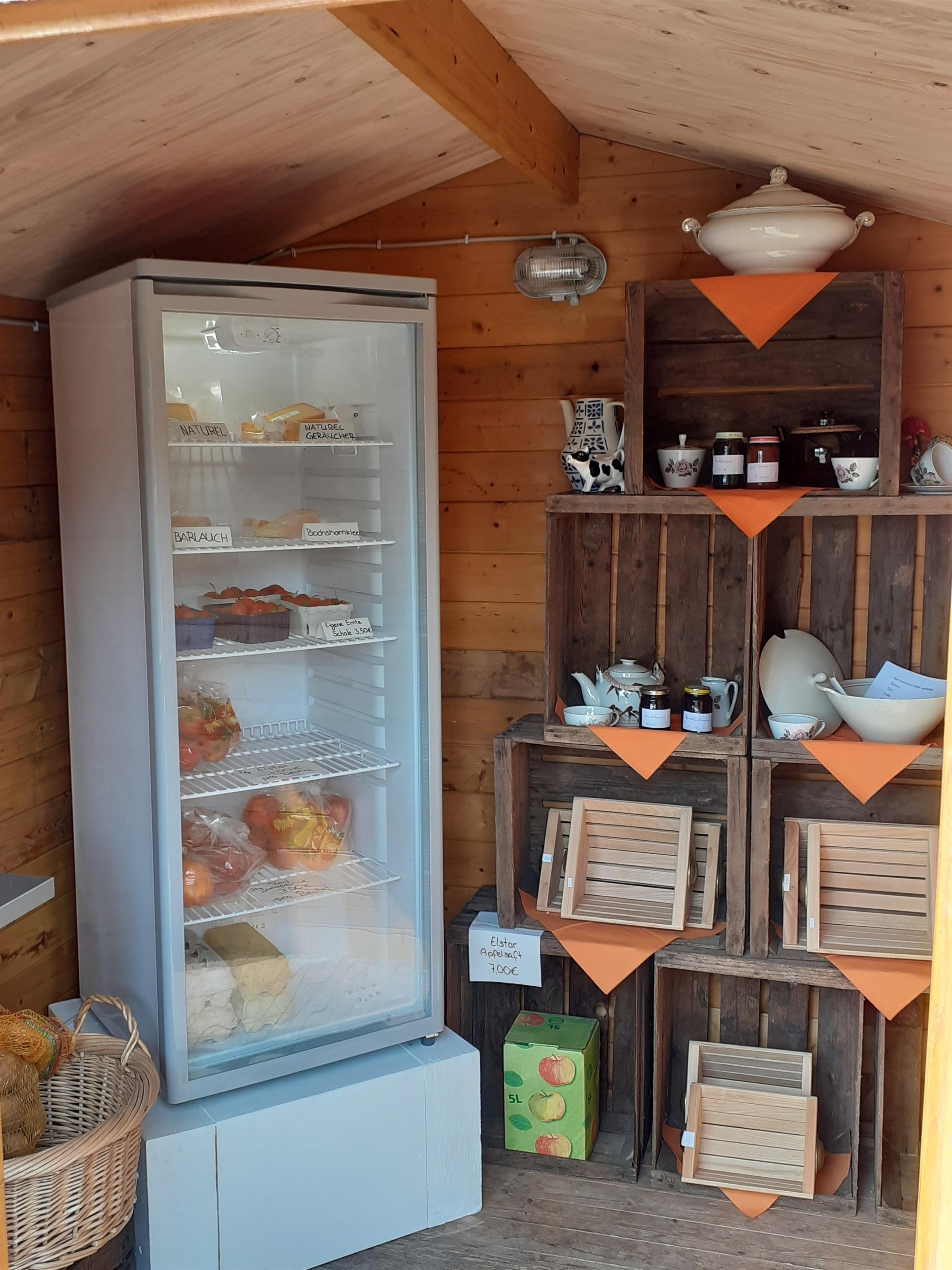 NEU bei uns ist ein Hofladen mit Käse von unserer Milch , Eier, Äpfel, Marmelade, Mettwurst, Leberwurst und Kartoffeln.