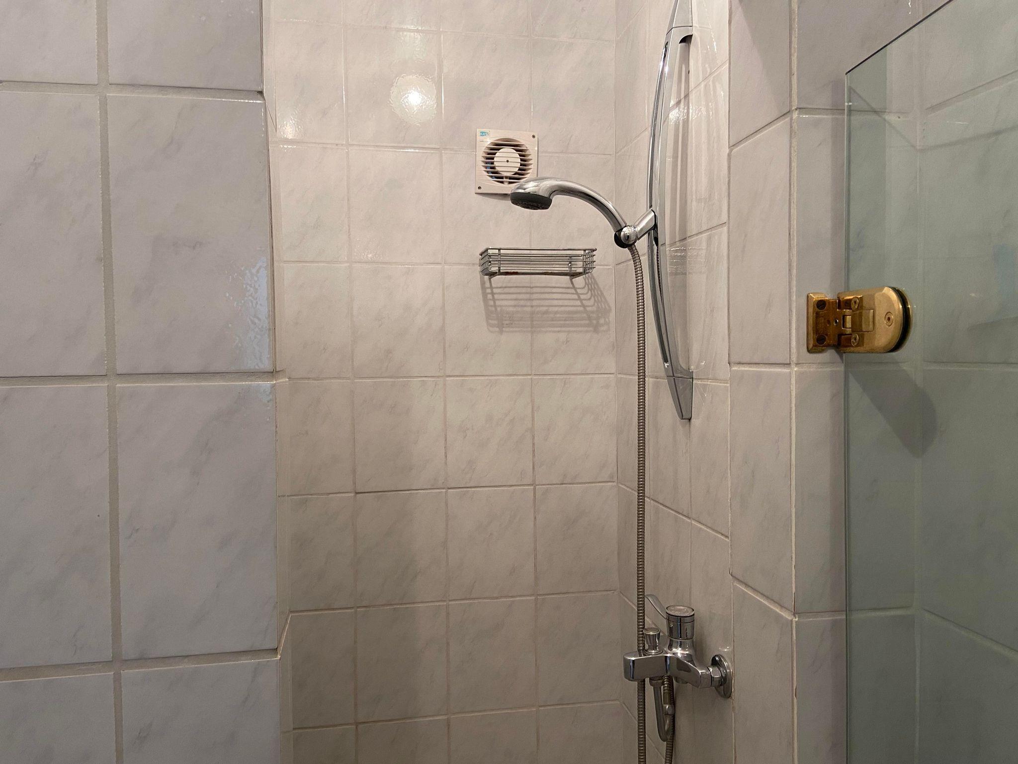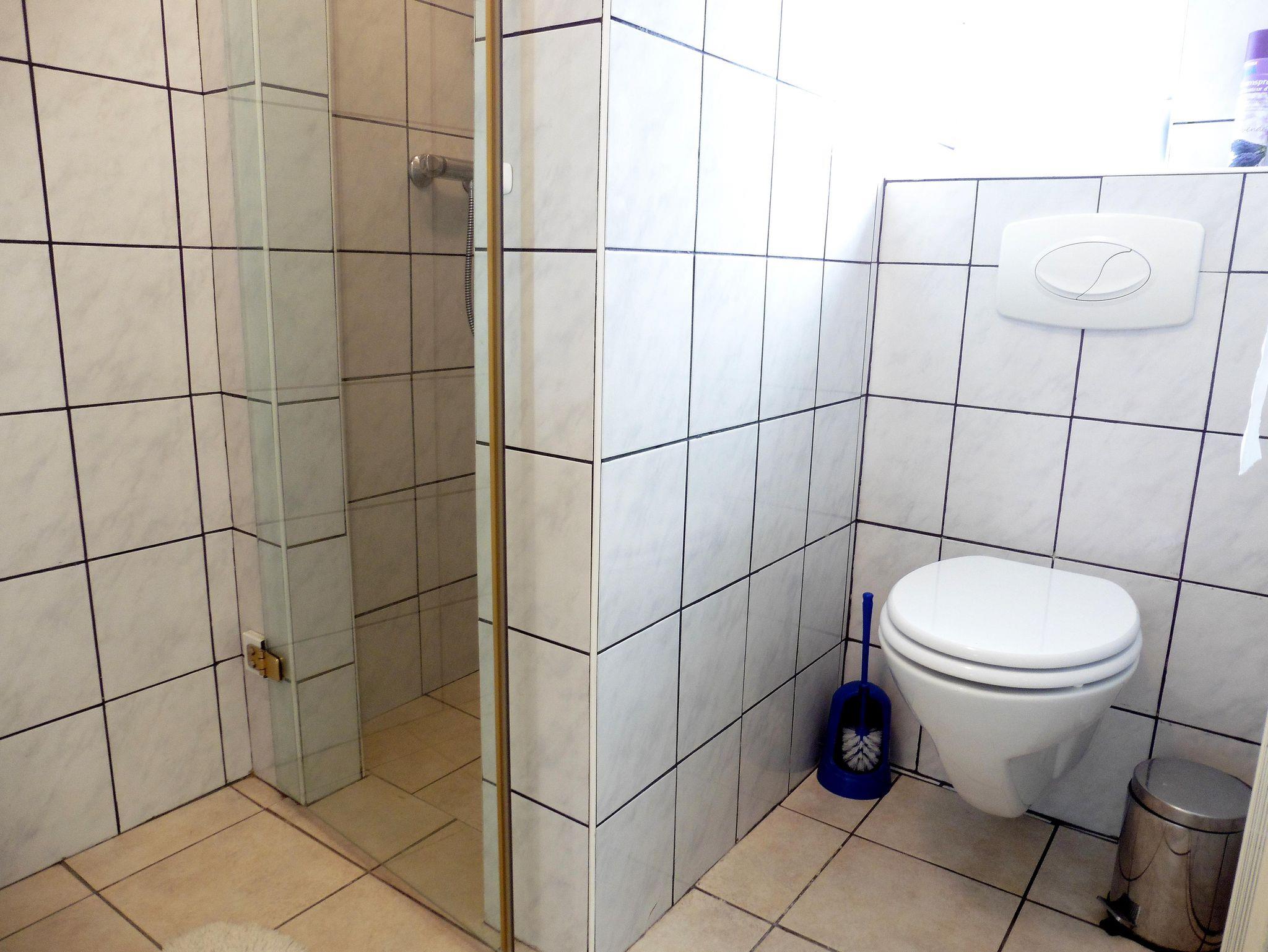 Badezimmer mit Dusche, Toilette und Waschbecken.