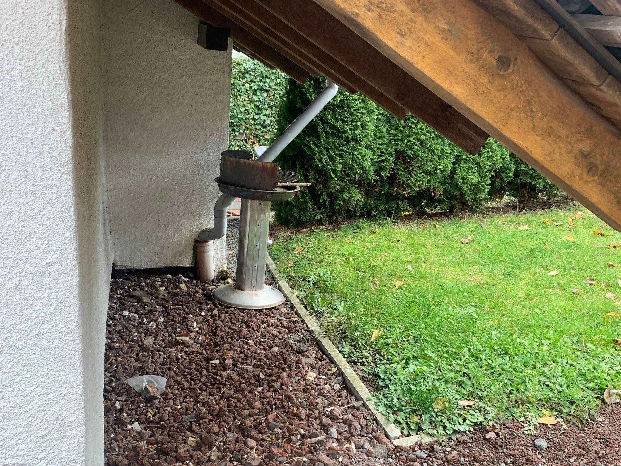 Hinter dem Haus befindet sich eine große Terrasse mit Gartenmöbeln, Kissen und Sonnenschirm.
