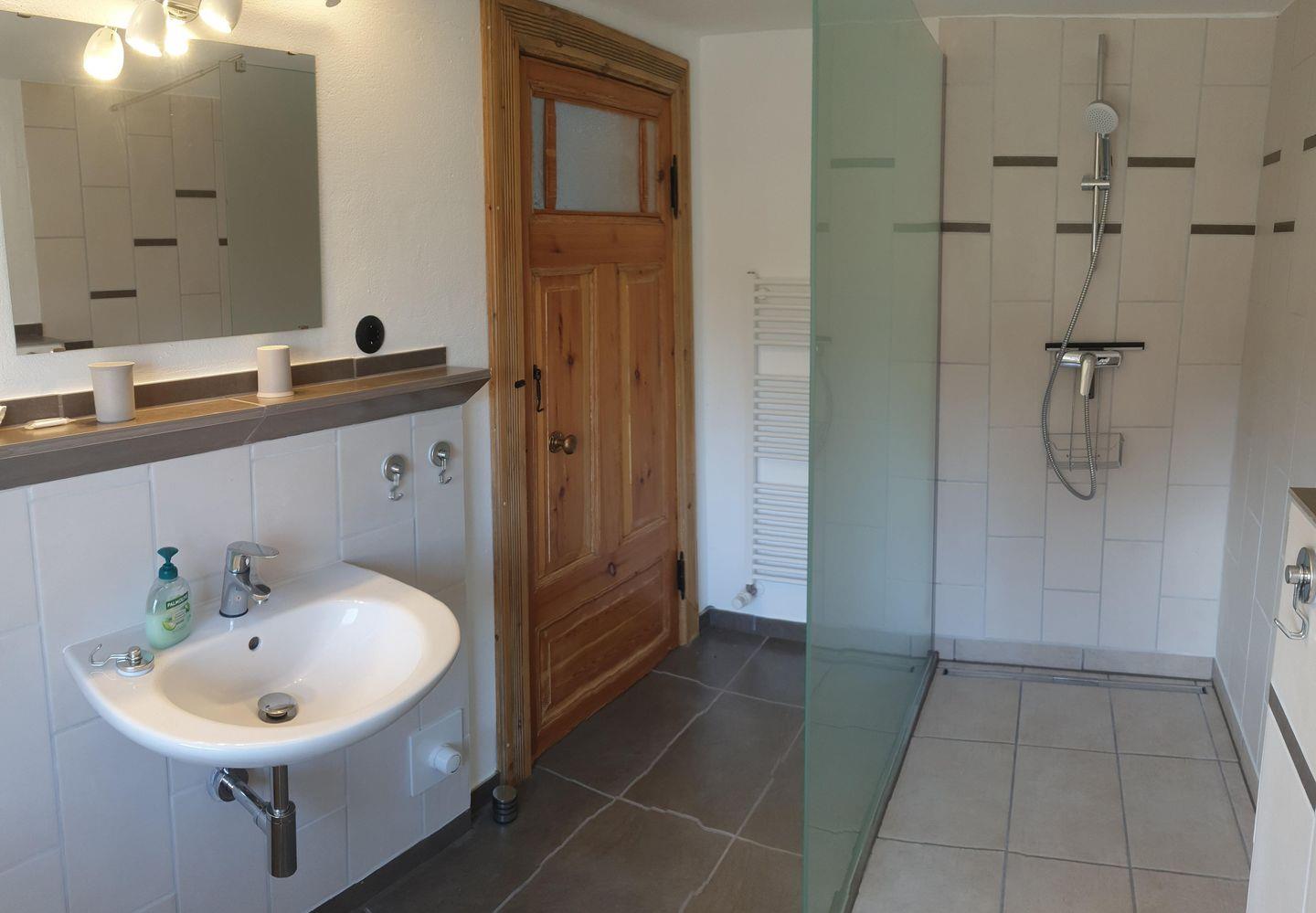 Das moderne Badezimmer ist mit einer ebenerdigen Dusche, WC, Haartrockner, Spiegel und Waschbecken ausgestattet und sorgt für zusätzlichen Komfort.