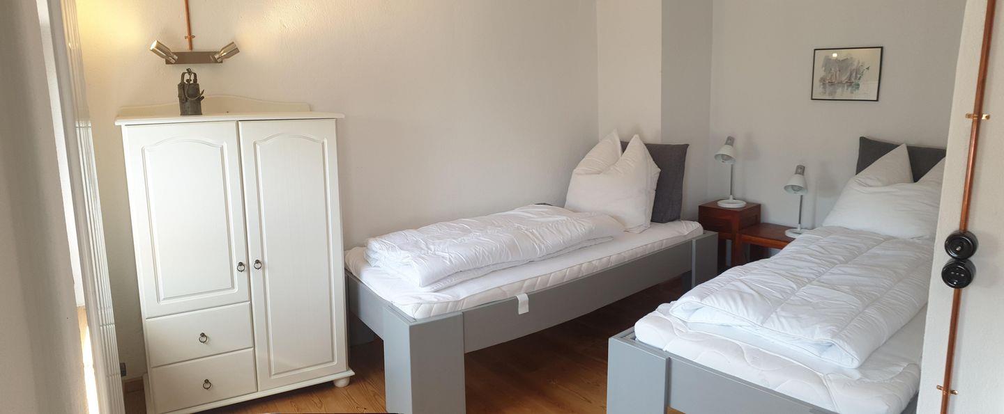 Die beiden Schlafzimmer sind liebevoll eingerichtet und bieten erholsame Nächte. Im ersten Schlafzimmer erwartet Sie ein kleines Doppelbett (140x200 cm) mit offener Fußende, einer Kommode und praktischen Kleiderhaken. Das zweite Schlafzimmer verfügt über zwei Einzelbetten (je 90x200 cm) sowie einen Kleiderschrank – beide Räume sind mit Verdunklungsmöglichkeiten ausgestattet.