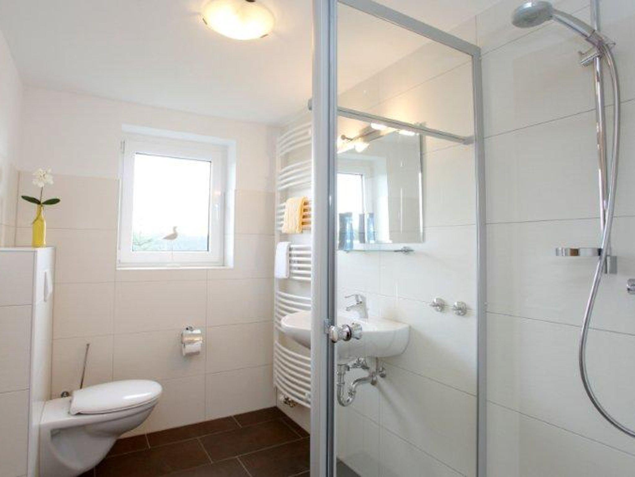 Ebenso das Tageslichtbad mit Dusche, Handtuchtrockner und Föhn.
