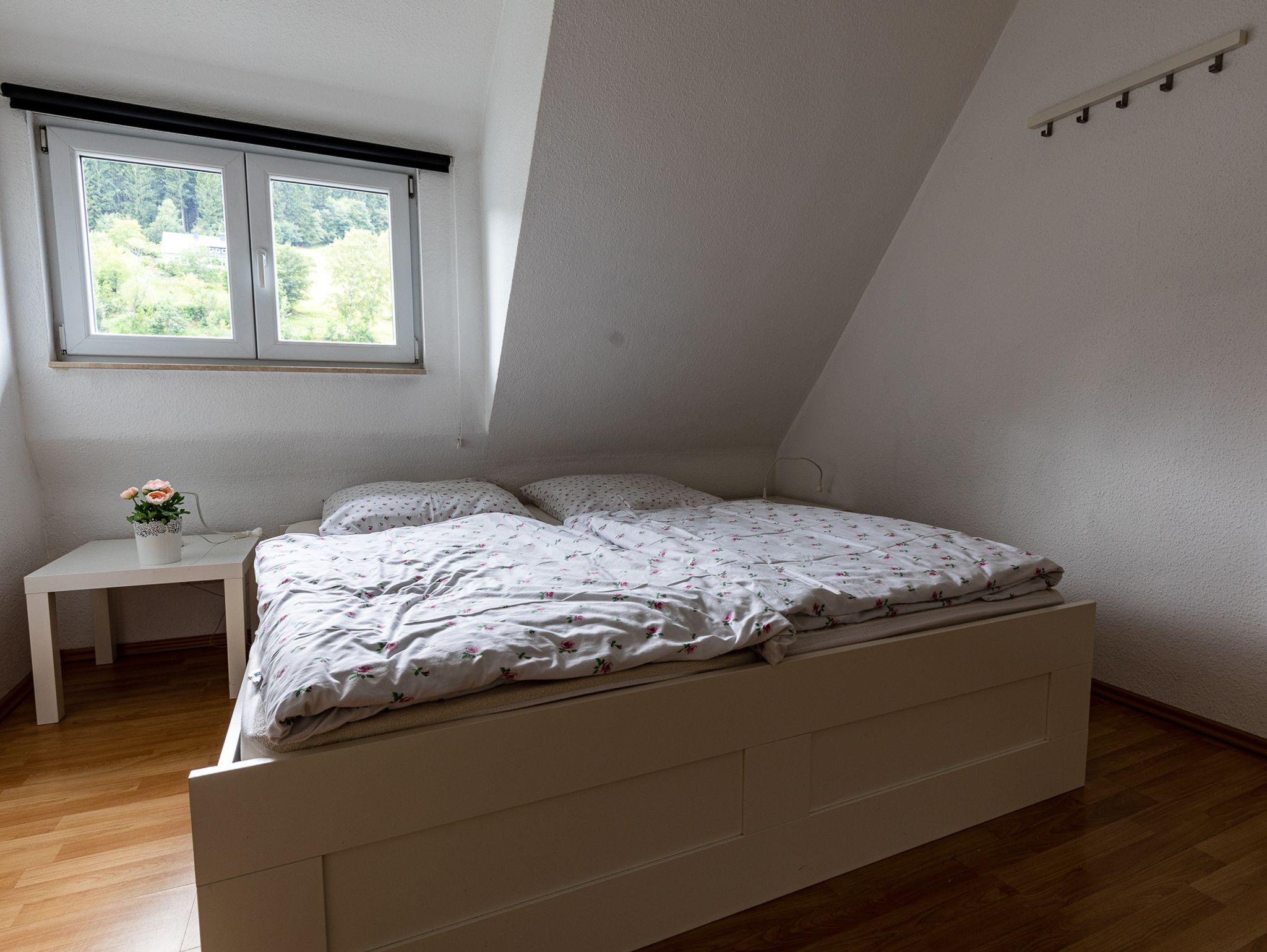 Man geht eine Treppe hoch auf dieser Etage befindet sich ein Bad, eine Küche, ein Doppelschlafzimmer und ein grosses Wohnzimmer mit einer Schlafcouch für zwei Personen.