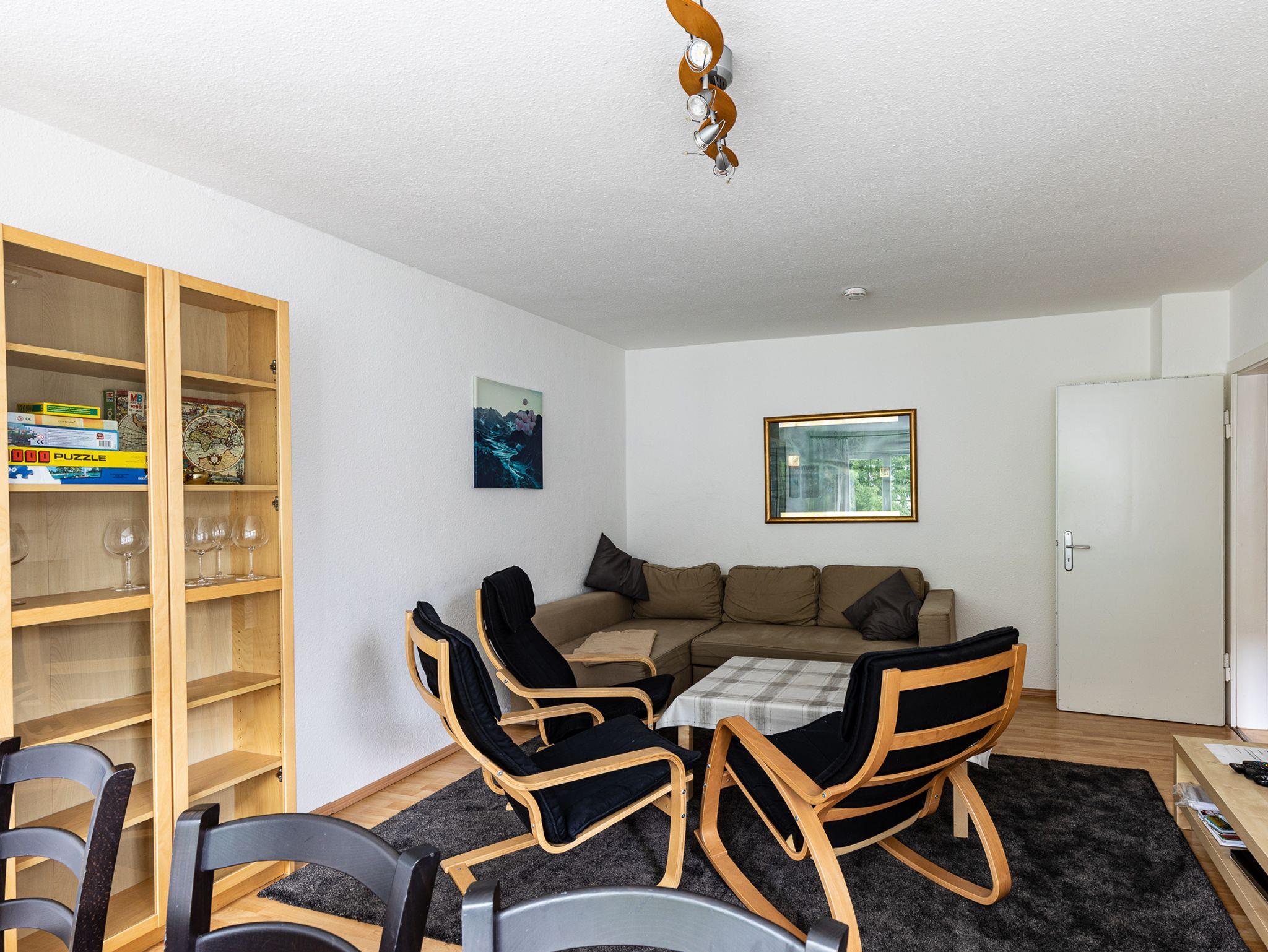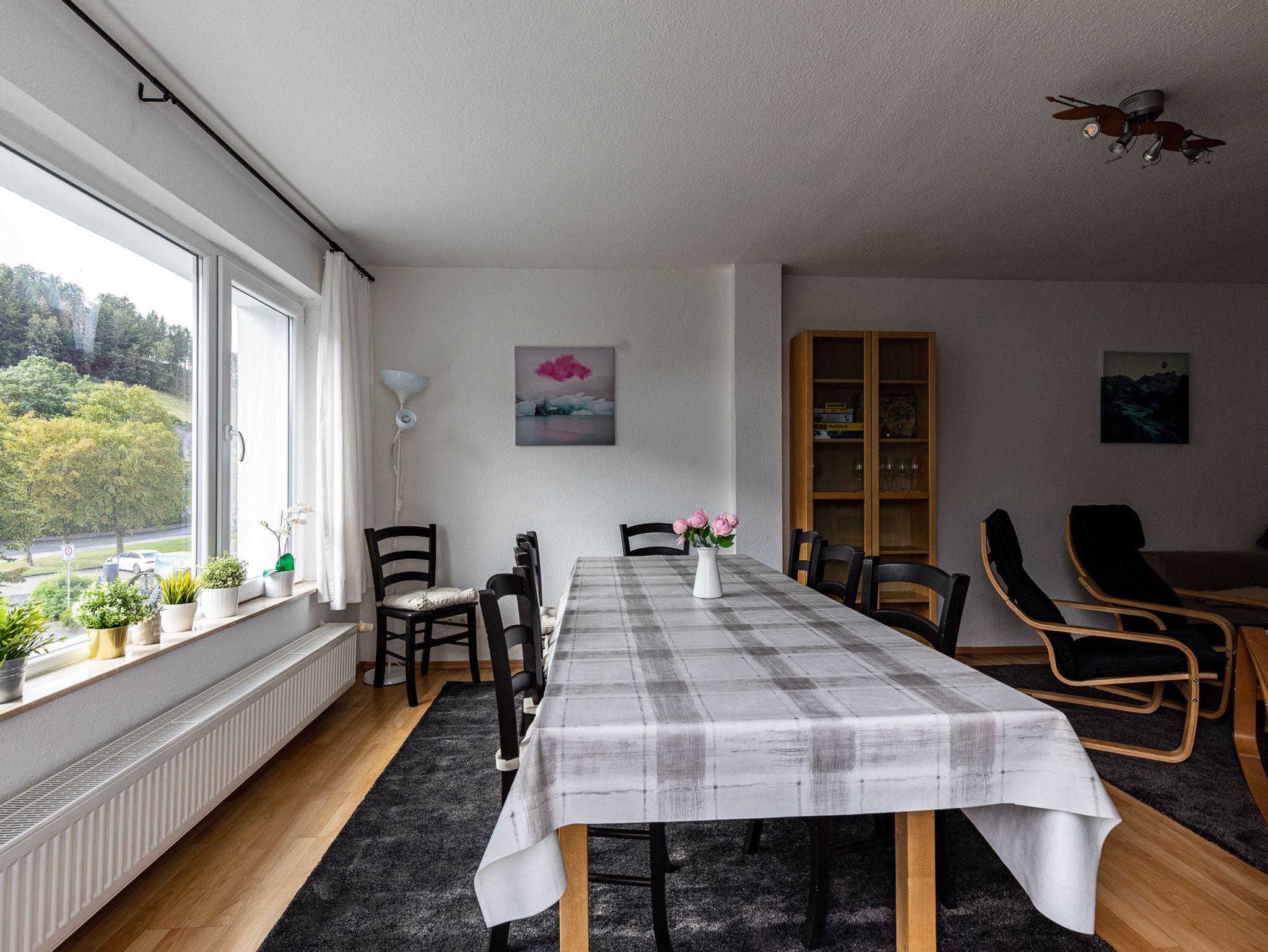 Vom Wohnzimmer welches auch einen großen Esstisch hat kann mann auf einen Balkon gehen auf den man einen wunderschönen Ausblick in die Berge hat.