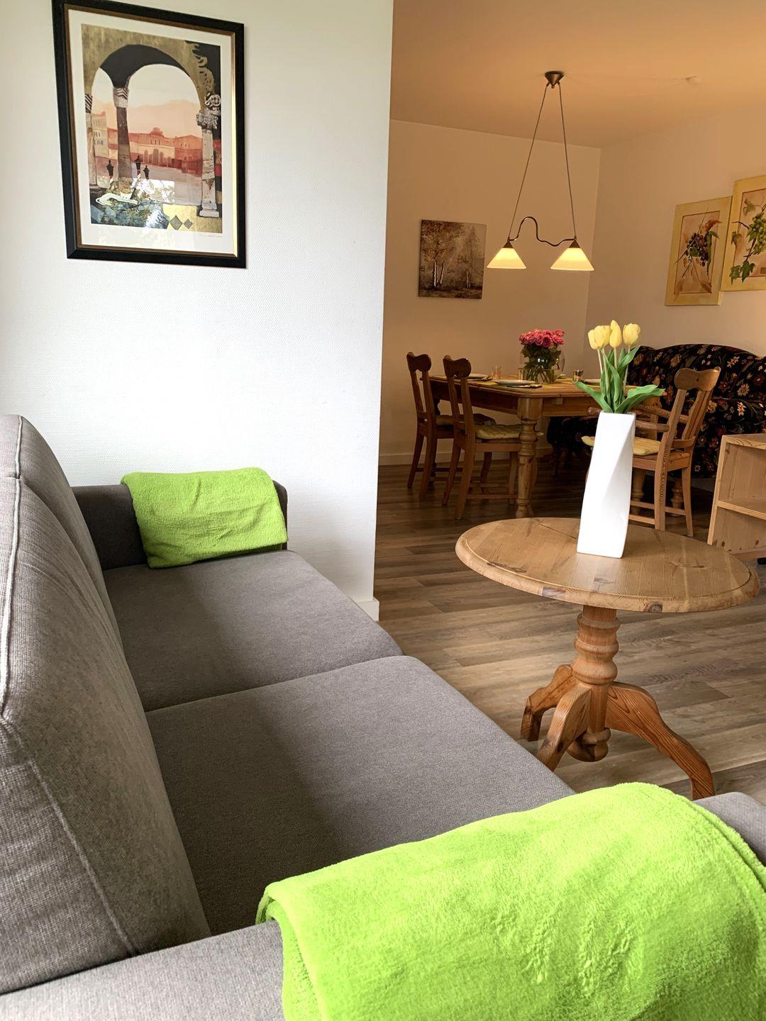 Insgesamt 54 m² Wohnfläche verteilen sich auf ein Wohnzimmer (ausklappbare Couch als Schlafmöglichkeit für die 3. und 4. Person) mit separatem Essbereich, Schlafzimmer mit Doppelbett, modern ausgestattete Küche, Bad mit Wanne / Dusche / Waschtisch / WC. Diele und Balkon.