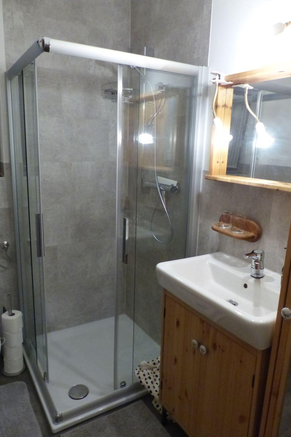 The bathroom has a shower cubicle, toilet and washbasin.