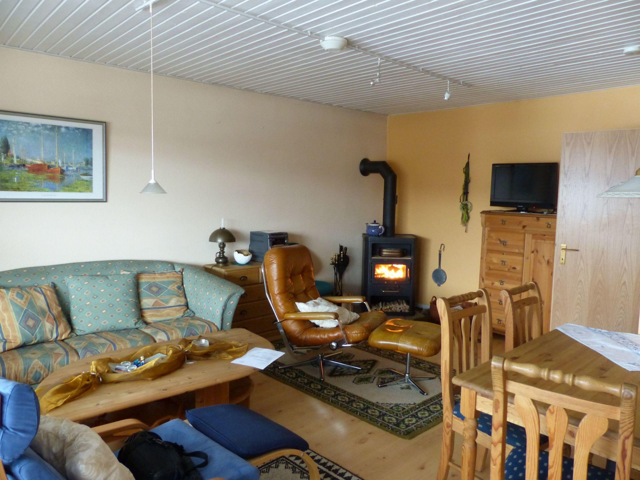 The living room has a cosy seating area with, among other things, a comfortable sofa bed, TV (satellite), music system and a wood-burning stove. The balcony is in front of the living room and is equipped with a wooden bench, table and chairs. The open kitchen has a cosy dining table. The kitchen is equipped with an electric oven/4 electric hotplates, fridge, freezer, grill, toaster, coffee machine, kettle and plenty of kitchen and dining utensils.