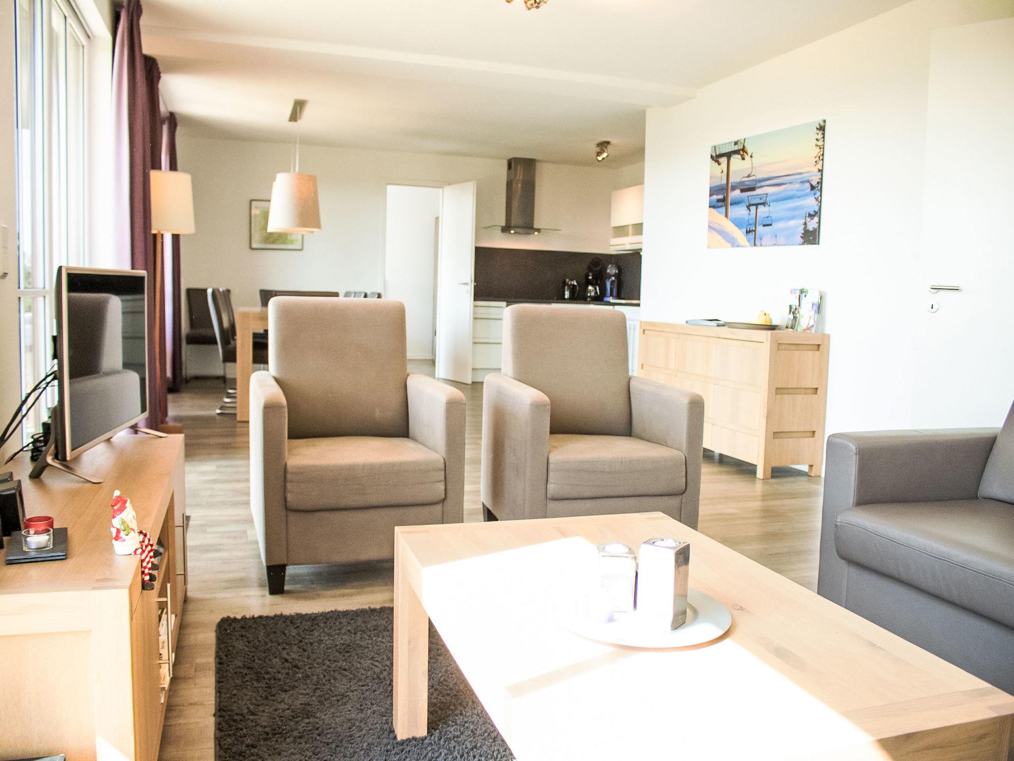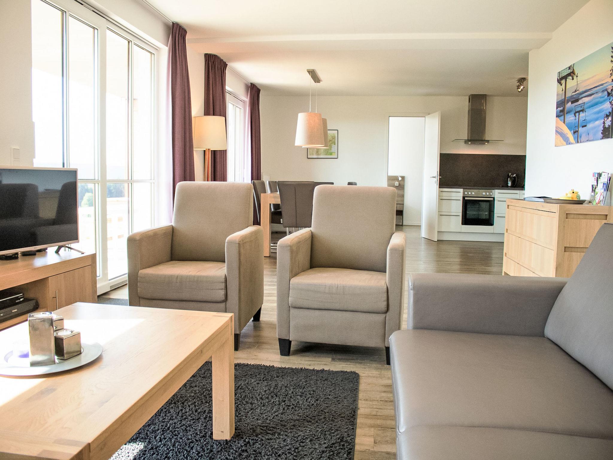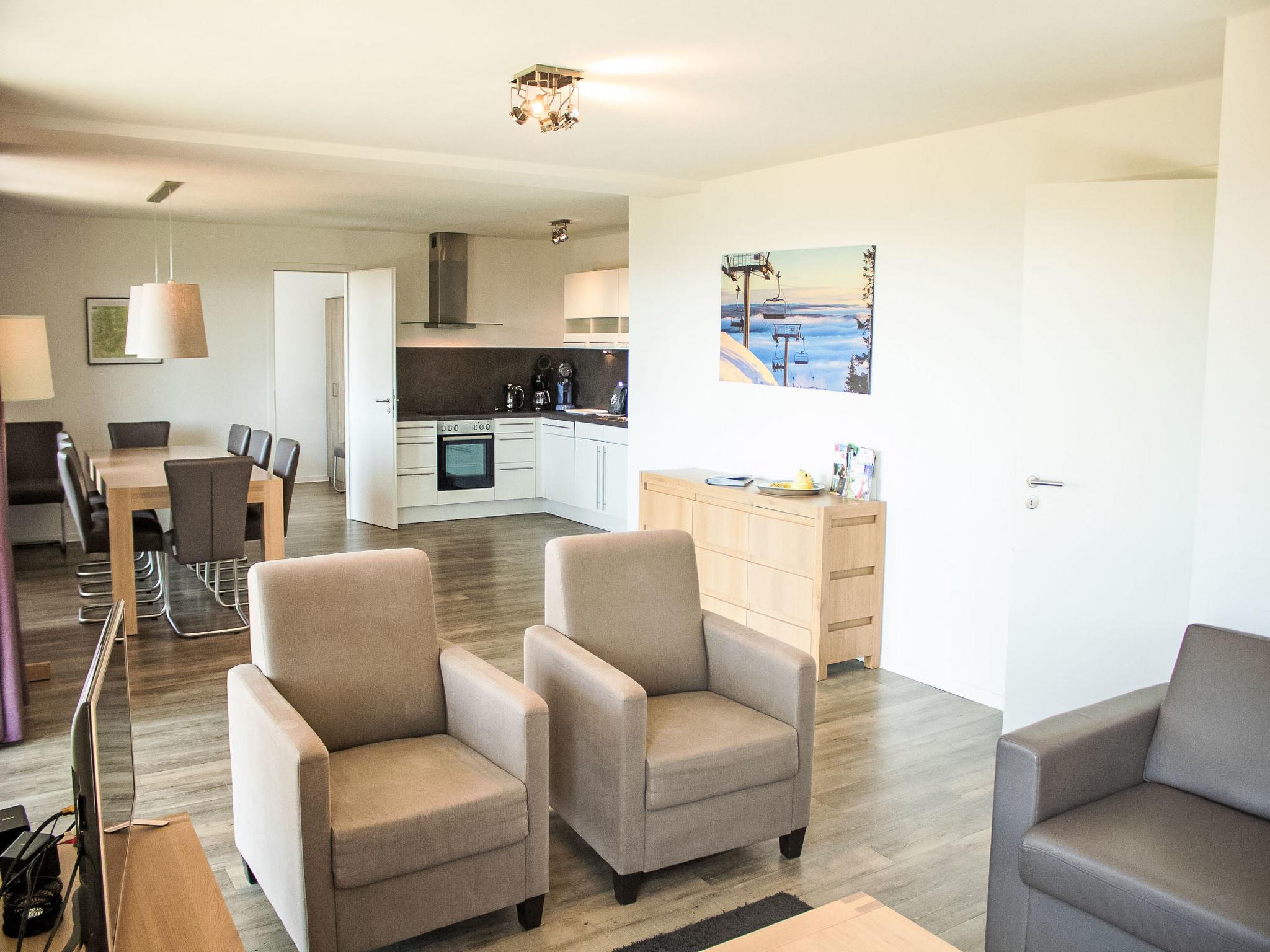"Blick ins Grüne", 4-room apartment 105 m2, on the ground floor. Modern and cosy furnishings: living/sleeping room with 1 double sofabed and satellite TV (flat screen). Exit to the terrace. 1 room with 1 double bed. 1 room with 1 double bed. 1 room with 1 x 2 bunk beds. Open kitchen (oven, dishwasher, 4 ceramic glass hob hotplates, microwave, electric coffee machine) with dining table. 2 showers/WC, sep. WC, Sauna. Terrace. Terrace furniture. Beautiful distant view. Facilities: washing machine, children's high chair, baby cot. Internet (WiFi, free). Parking. Please note: non-smokers only. Smoke alarm, fire extinguisher.