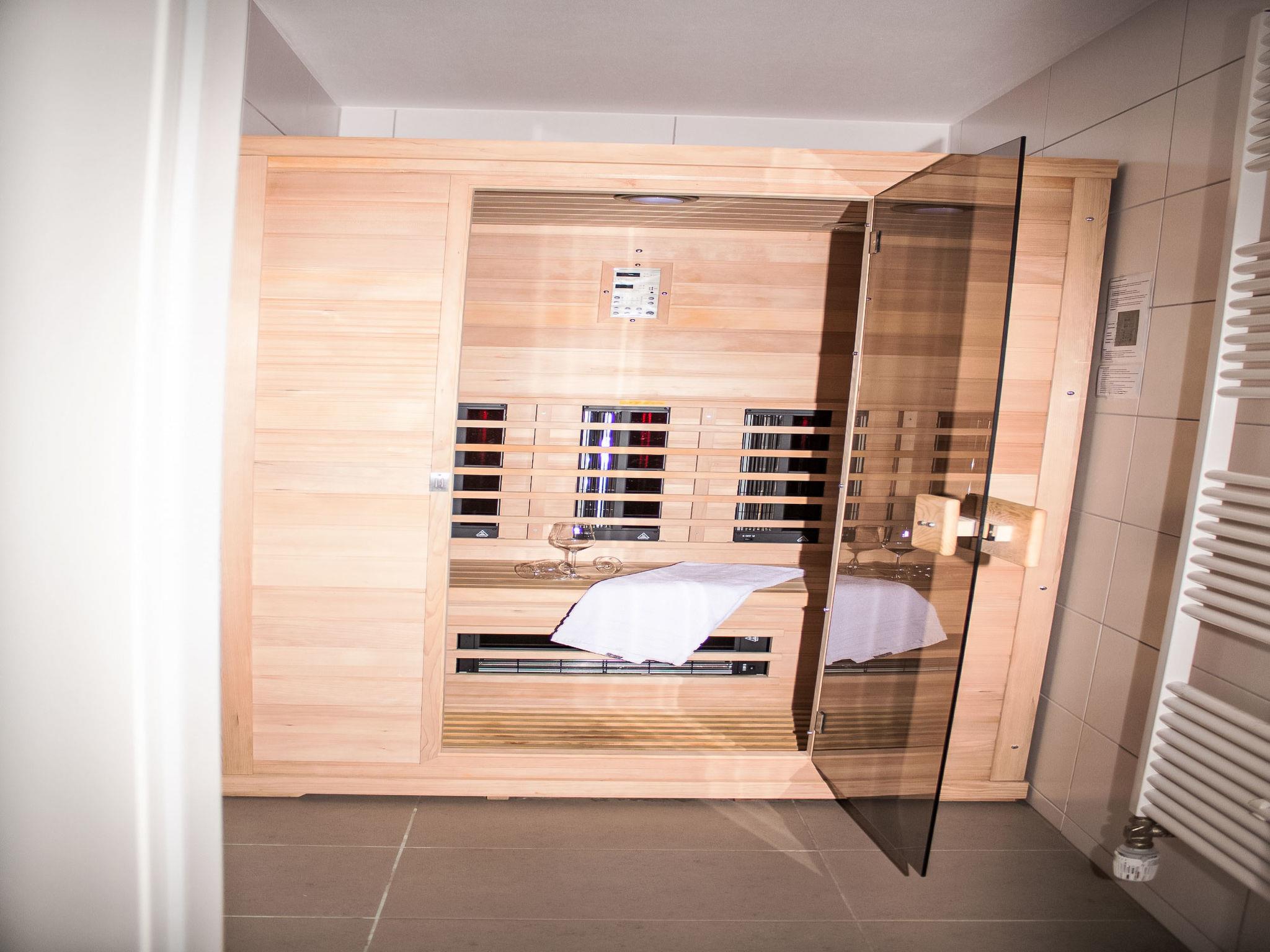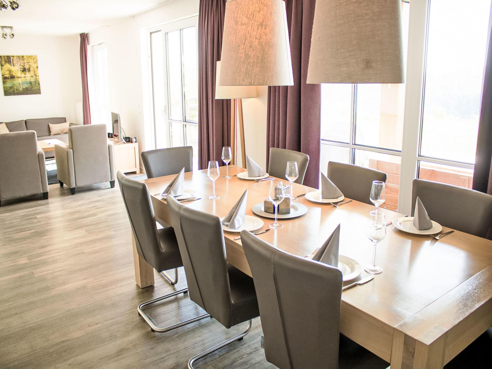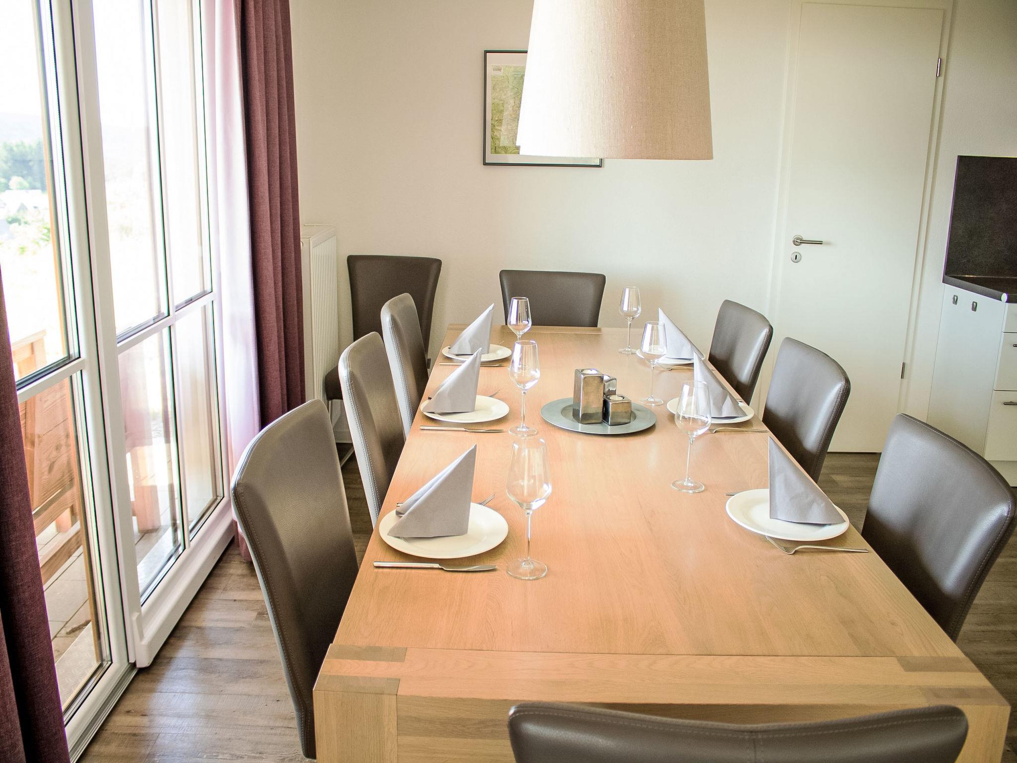 "Blick ins Grüne", 4-room apartment 105 m2, on the ground floor. Modern and cosy furnishings: living/sleeping room with 1 double sofabed and satellite TV (flat screen). Exit to the terrace. 1 room with 1 double bed. 1 room with 1 double bed. 1 room with 1 x 2 bunk beds. Open kitchen (oven, dishwasher, 4 ceramic glass hob hotplates, microwave, electric coffee machine) with dining table. 2 showers/WC, sep. WC, Sauna. Terrace. Terrace furniture. Beautiful distant view. Facilities: washing machine, children's high chair, baby cot. Internet (WiFi, free). Parking. Please note: non-smokers only. Smoke alarm, fire extinguisher.