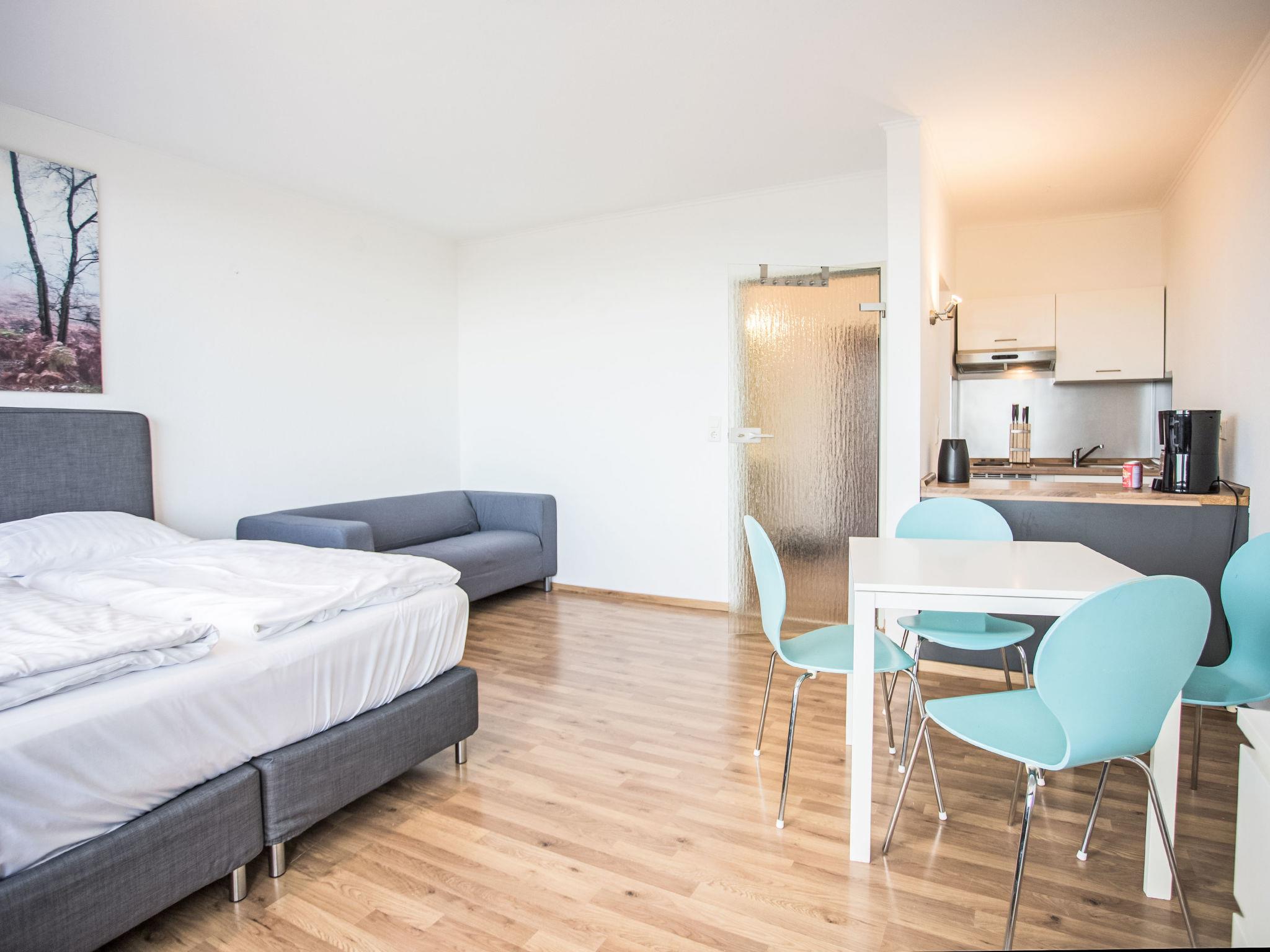 "Fernblick", 1-room apartment 38 m2, on the upper floor. Practical and modern furnishings: living/sleeping room with 1 double bed and satellite TV (flat screen). Exit to the balcony. Small, open kitchen (2 hot plates, toaster, kettle, electric coffee machine) with dining table. Bath/WC. Heating. Balcony. Balcony furniture. Beautiful panoramic view. Facilities: Internet (WiFi). Parking. Please note: non-smokers only. Maximum 1 pet/ dog allowed. Smoke alarm, fire extinguisher.
