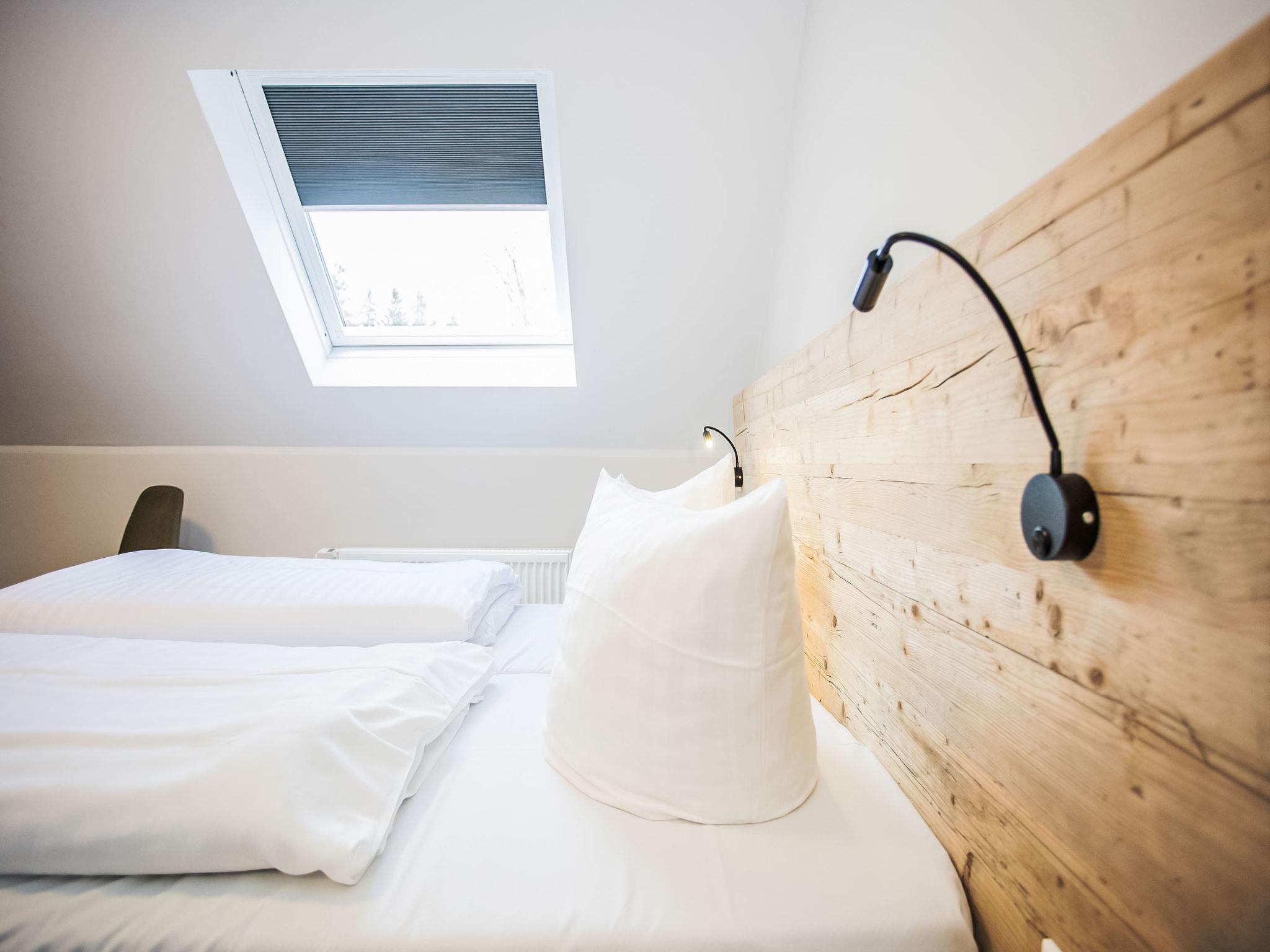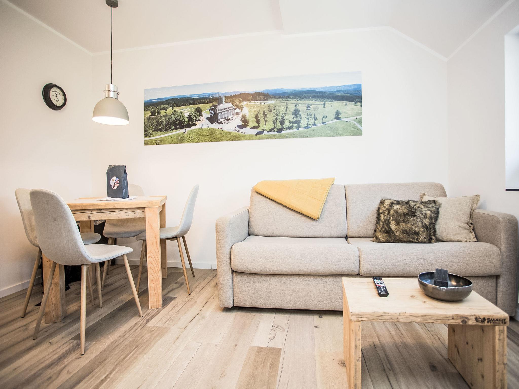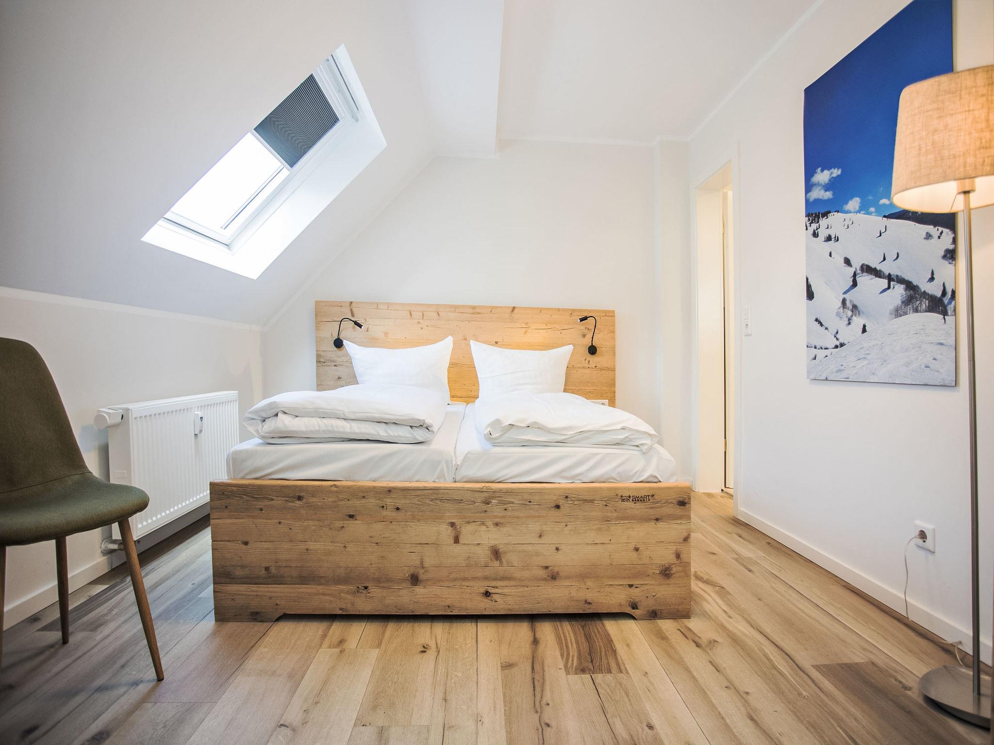 "Winterfreude", 2-room apartment 33 m2 on 2nd floor. Object suitable for 2 adults + 2 children. Cosy and wooden furniture furnishings: living/sleeping room with sloping ceilings with 1 double sofabed and satellite TV (flat screen). With sloping ceilings, 1 room with 1 double bed and satellite TV (flat screen). Kitchenette (dishwasher, 2 induction hot plates, toaster, kettle, microwave, freezer) with dining table. Shower/WC. Electric heating. Wooden floors. Facilities: Internet (WiFi, free). Please note: non-smokers only. Maximum 1 pet/ dog allowed.