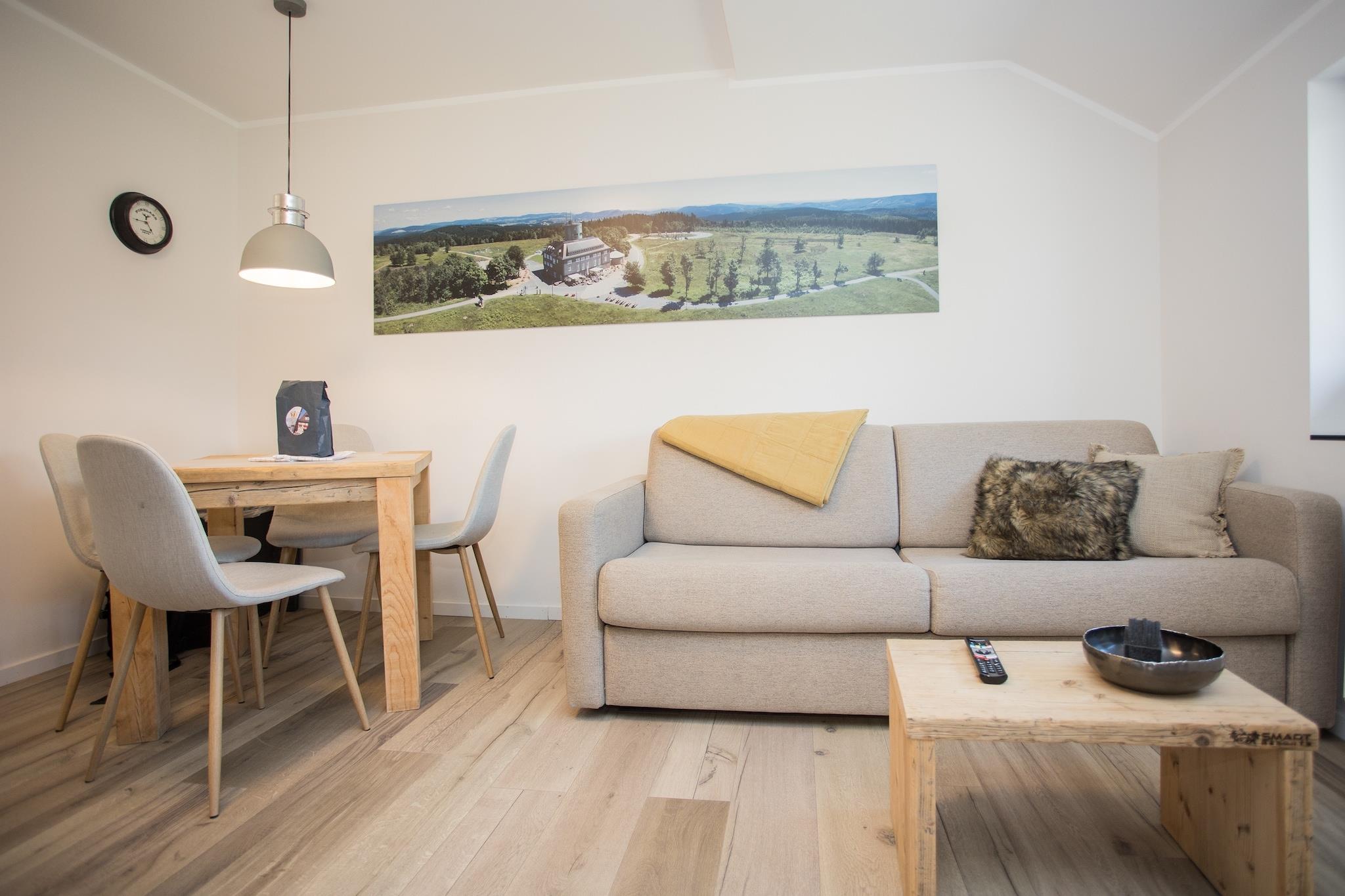 This bright, welcoming apartment is located near the beautiful mountains of Sauerland. The perfect base for a day on the slopes. Go skiing, sledging and tobogganing, or take a lovely walk or a scenic bike ride with the whole family. The accommodation offers room for 4 people (2 adults, 2 children) and is on the 2nd floor. You reach the accommodation via the stairs. All rooms in the accommodation are on one floor, but some rooms are linked with steps. In the living room, you will find a comfortable sofa bed with a television and a dining table for four. The kitchen is equipped with all mod cons: with an induction hob, combi microwave, dishwasher, fridge-freezer, toaster, kettle and Nespresso coffee machine, you have everything you need to prepare meals during your stay. The bedroom with a double bed (2x 90x200cm) is next to the kitchen. The bedroom has a second TV so you can watch TV from the comfort of your bed. There are also 2 bedside tables, bedside lamps and a wardrobe. The sofa bed in the living room can accommodate 2 children. The bathroom has a walk-in/rain shower, toilet, washbasin and towel radiator. The accommodation overlooks the Sauerland mountains. You can enjoy a leisurely walk in the area with your dog, who can join you on holiday because this accommodation allows one pet. There is no washing machine in the accommodation, but you may use the one in the shared storage room for bikes and skis free of charge. This accommodation is in Neuastenberg. The centre of Neuastenberg has a bakery and several restaurants where you can enjoy a tasty meal or a drink. It also has a small family-friendly ski area, including a natural toboggan run. The area is quiet and friendly but there is plenty to do on skis, sledge, bike or walking. You won't get bored easily here!
