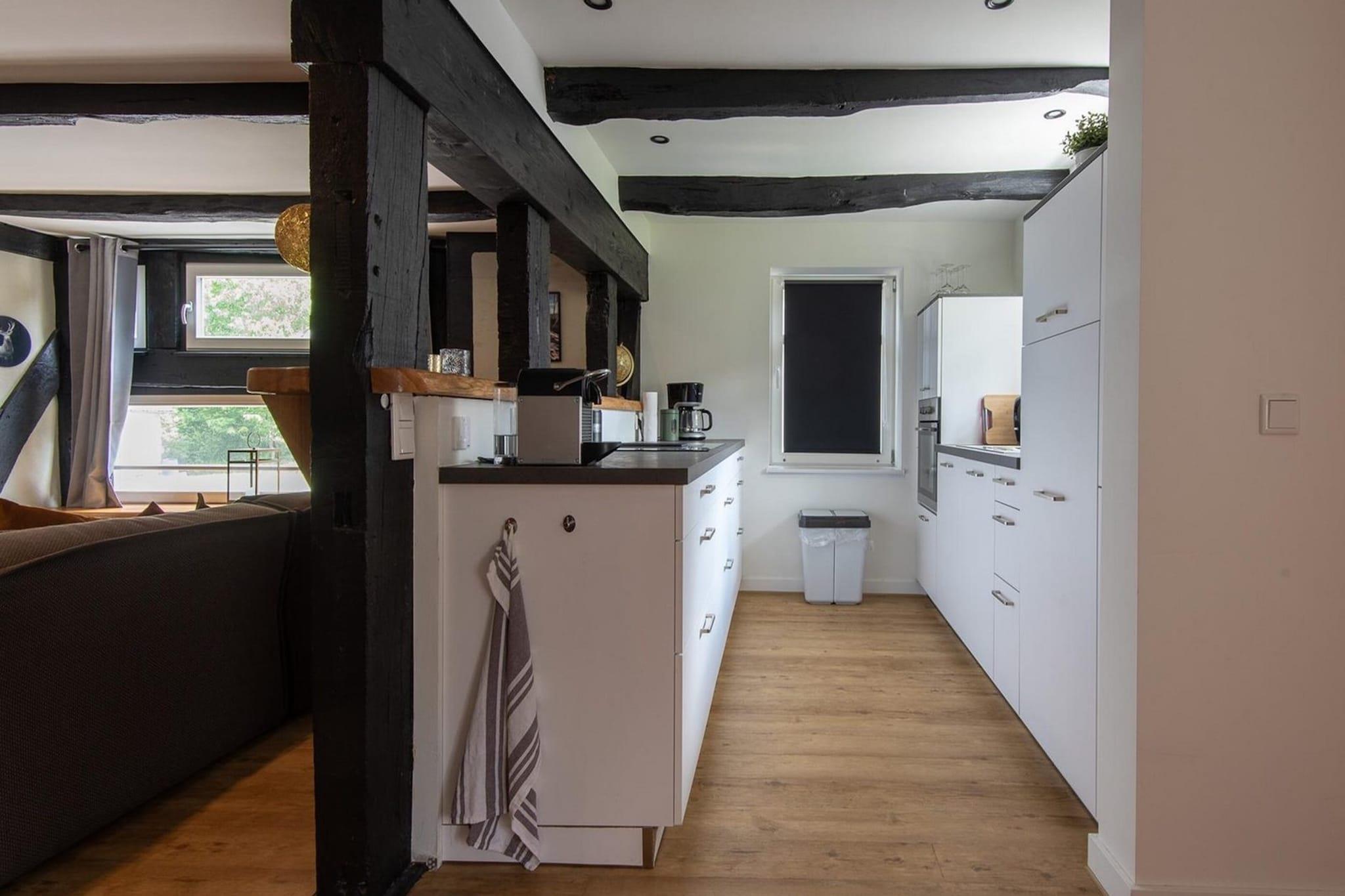 You enter the very spacious holiday home for 12 people through the hall with cloakroom (280m2 in total). On the first floor you will find a spacious, luxurious living room, a fully equipped modern kitchen and a large dining table with plenty of space. On the same floor there are 2 bedrooms with 2 double beds. One bedroom has a double bed and 2 single beds. The 2 spacious bathrooms have a rain shower and a sink. The 2 separate toilets have a sink. On the 2nd floor you will also find a spacious, luxurious living room, a fully equipped modern kitchen and a large dining table with plenty of space. There are 2 bedrooms with 2 single beds. The 2 spacious bathrooms have a rain shower and a sink. The separate toilet has a sink. On the premises there is a cozy wooden pavilion next to a campfire area. Here you can enjoy a snack or a drink in the evening and of course there is also a grill. In total there is a 1600 m2 plot surrounding the house with a nice large lawn for the children to play or play football. There is enough space for everyone to let off steam. Freshly laundered linens are provided for all guests. The Haus Zur Mühle is a beautiful historic building that has a lot of history with it. It was built in 1790 and renovated in 2022. Due to its historical value, it is listed, which means it is a listed building that preserves its historical and cultural value. It was originally a water mill and has been converted into modern and luxurious apartments. This allows guests to enjoy modern amenities in a historic building. The Haus zur Mühle in Elkeringhausen is located in the middle of a natural environment. This offers guests the opportunity to enjoy the beauty of nature and the tranquil surroundings. Just a 3-minute drive from Winterberg, you'll have easy access to the amenities and activities this popular destination has to offer. Within walking distance there is a children's playground with a beautiful pond. Haus Zur Mühle is a beautiful place for a vacation with family or friends with a combination of history, nature and modern amenities.