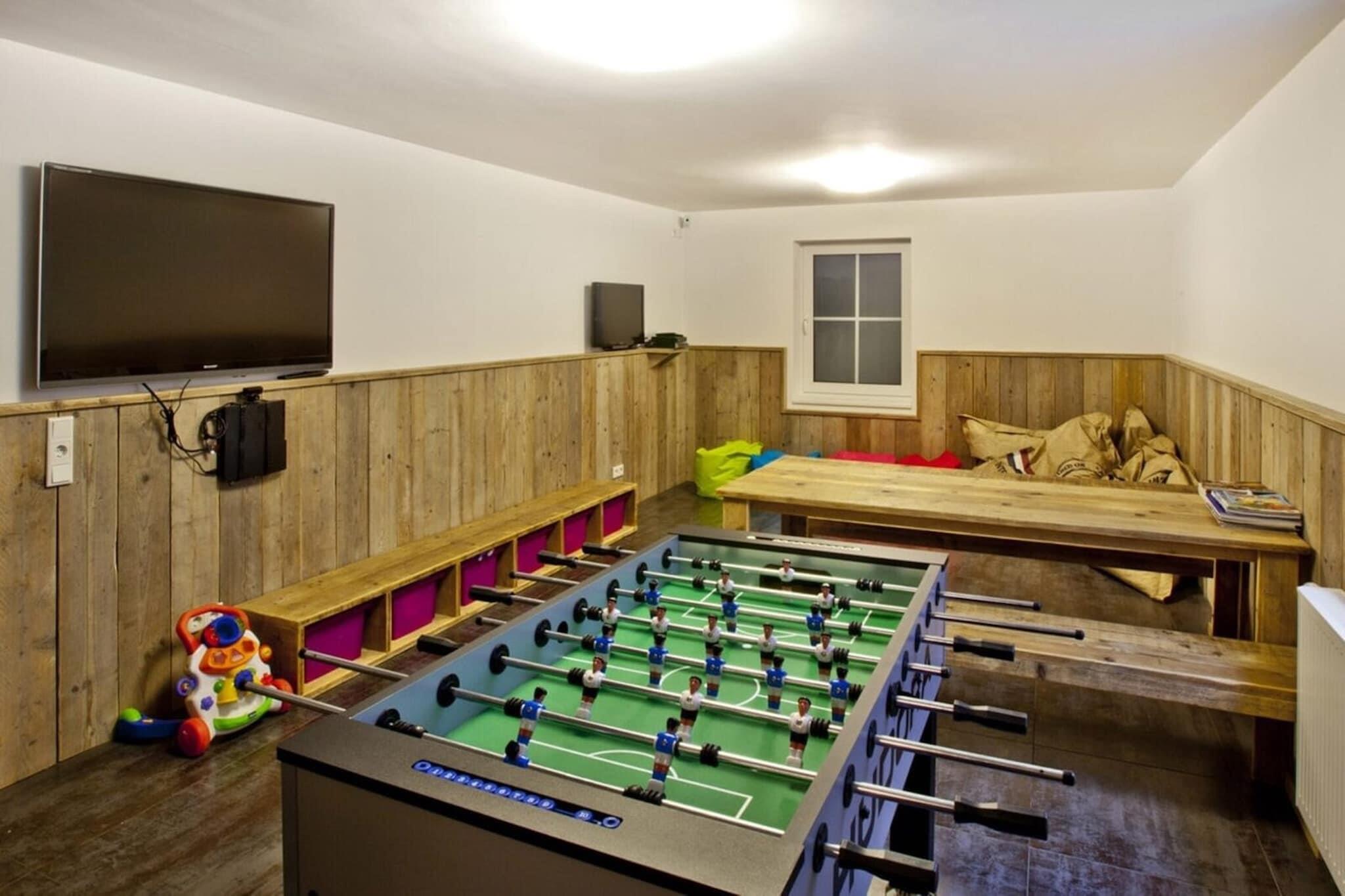 På 1. etage: (Stue(Fjernsyn(fladskærm), spisebord, sofahjørne), åbent køkken(elkedel, komfur, kaffemaskine(kopper, kaffetragt), ovn, combi-mikroovn, opvaskemaskine , køleskab, fryser), soveværelse(dobbeltseng), soveværelse(enkeltseng), soveværelse(køjeseng), soveværelse(3-etage-køjeseng), badeværelse(badekar, bruser, håndvask, toilet, føntørrer), toilet(håndvask), Repos) tremmeseng, terrasse, have(deles med andre gæster), havemøbler, trampolin, bordfodbold, barnestol, hyggespil, Haveskur, Gyngestativ, playstation
