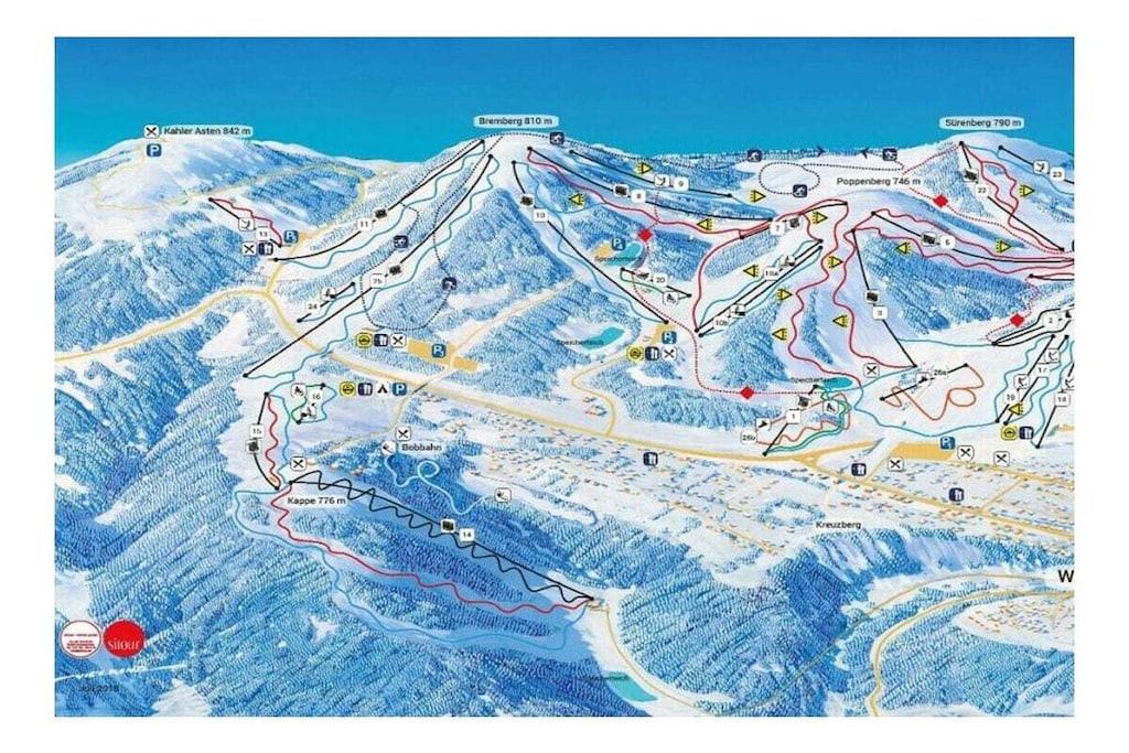 The cozy 74-square-meter apartment offers space for up to 6 people. The open-plan living/kitchen area is ideal for family evenings. The fully equipped kitchen provides everything you need for your next cooking evening. Two bedrooms have a double bed, one also has a flat-screen TV. The third bedroom is furnished with a bunk bed. The modern bathroom features a shower, bathtub, and toilet. Free parking is available in front of the accommodation. Your four-legged friends are also welcome. Various supermarkets, restaurants, nightlife, public transport, and the ski bus are within walking distance. A public swimming pool, a ski lift, and cross-country skiing trails are just 1 km from the apartment. For more detailed information on the various skiing options in Winterberg, please visit the Winterberg Tourist Information website.