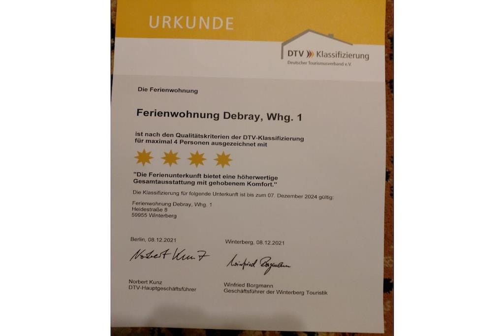 En fuldt udstyret ferielejlighed med to dobbeltværelser med boxmadras. Stuen har kabel-tv og stereoanlæg. Det fuldt udstyrede køkken har elektrisk komfur og ovn, keramisk kogeplade, opvaskemaskine, mikrobølgeovn, kaffemaskine, elkedel, køleskab, brødrister og alt nødvendigt service og redskaber. Badeværelset har badekar og bruser. Der er en ladestation til elbiler. Om sommeren kan gæsterne nyde haven med græsplæne og havemøbler. Lejligheden ligger i en rolig, men central beliggenhed, direkte ved siden af ski- og vandreområdet. Bymidten ligger 5 minutters gang derfra. En cykelpark, bobslæde- og kælkebane, vandreruten Rothaarsteig, cykelstien i Ruhrdalen, en panoramabro og en klatrepark er alle inden for rækkevidde.