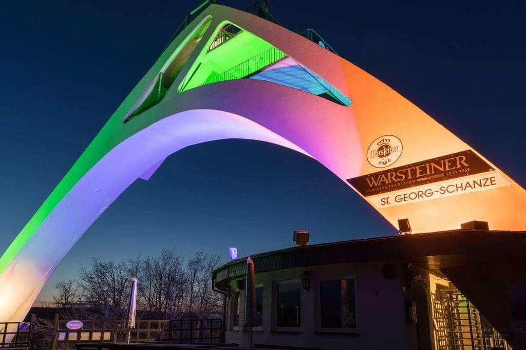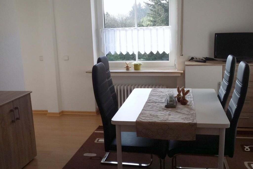 Fully equipped holiday apartment with one bedroom featuring a box-spring bed. Living room with a sofa bed, cable TV, and stereo system. Fully equipped kitchen with electric stove and oven, ceramic hob, dishwasher, microwave, coffee maker, kettle, refrigerator, toaster, and all necessary dishes and utensils. Bathroom with bathtub and shower. In summer, the apartment offers a garden with a lawn and garden furniture. The apartment is situated in a quiet yet central location, directly adjacent to the ski and hiking area. The town center is a 5-minute walk away. A bike park, bobsleigh and toboggan run, the Rothaarsteig hiking trail, the Ruhr Valley Cycle Path, a panoramic bridge, and a climbing park are all within easy reach.