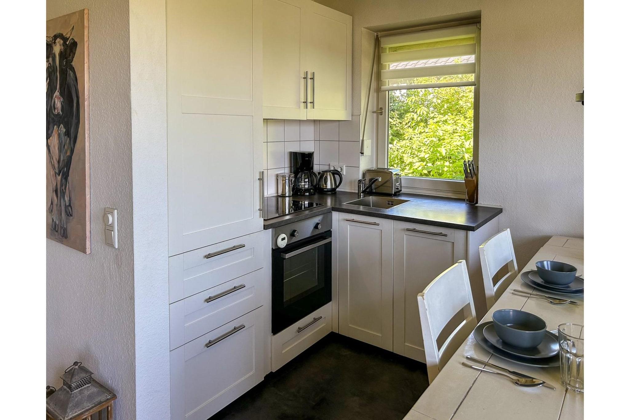 Stueetage: (åbent køkken(elkedel, brødrister, komfur, kaffemaskine, ovn, mikrobølgeovn, opvaskemaskine , køle-fryseskab), stue / spisestue(Fjernsyn, spisebord, sofahjørne), soveværelse(dobbeltseng(180 x 200 cm)), svalegang soveværelse(gennem en lav indgang)(enkeltseng(90 x 200 cm), enkeltseng(90 x 200 cm)), badeværelse(bruser, håndvask, toilet, føntørrer)) have, havemøbler, grill, parkering, barnestol, Vaskeripakke mod et gebyr