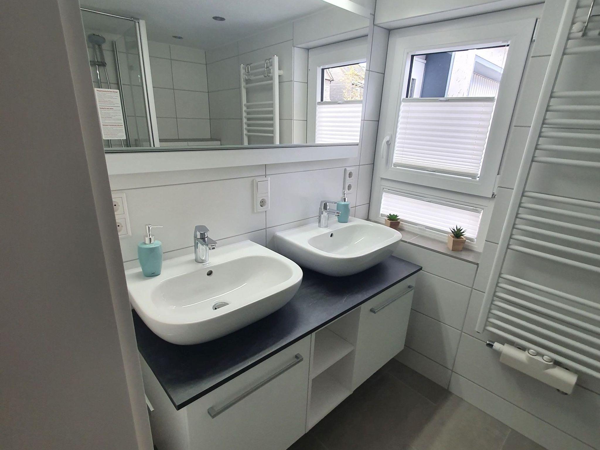 Das Badezimmer mit Fußbodenheizung und Tageslicht hat zwei Waschbecken, eine ebenerdige Dusche und ein WC. Ein weiteres Gäste WC steht zur alleinigen Nutzung zur Verfügung, befindet sich im Eingangsbereich vor der Wohnungstür.
