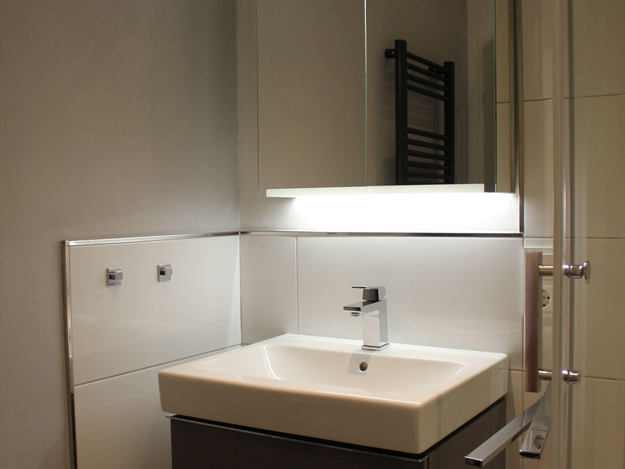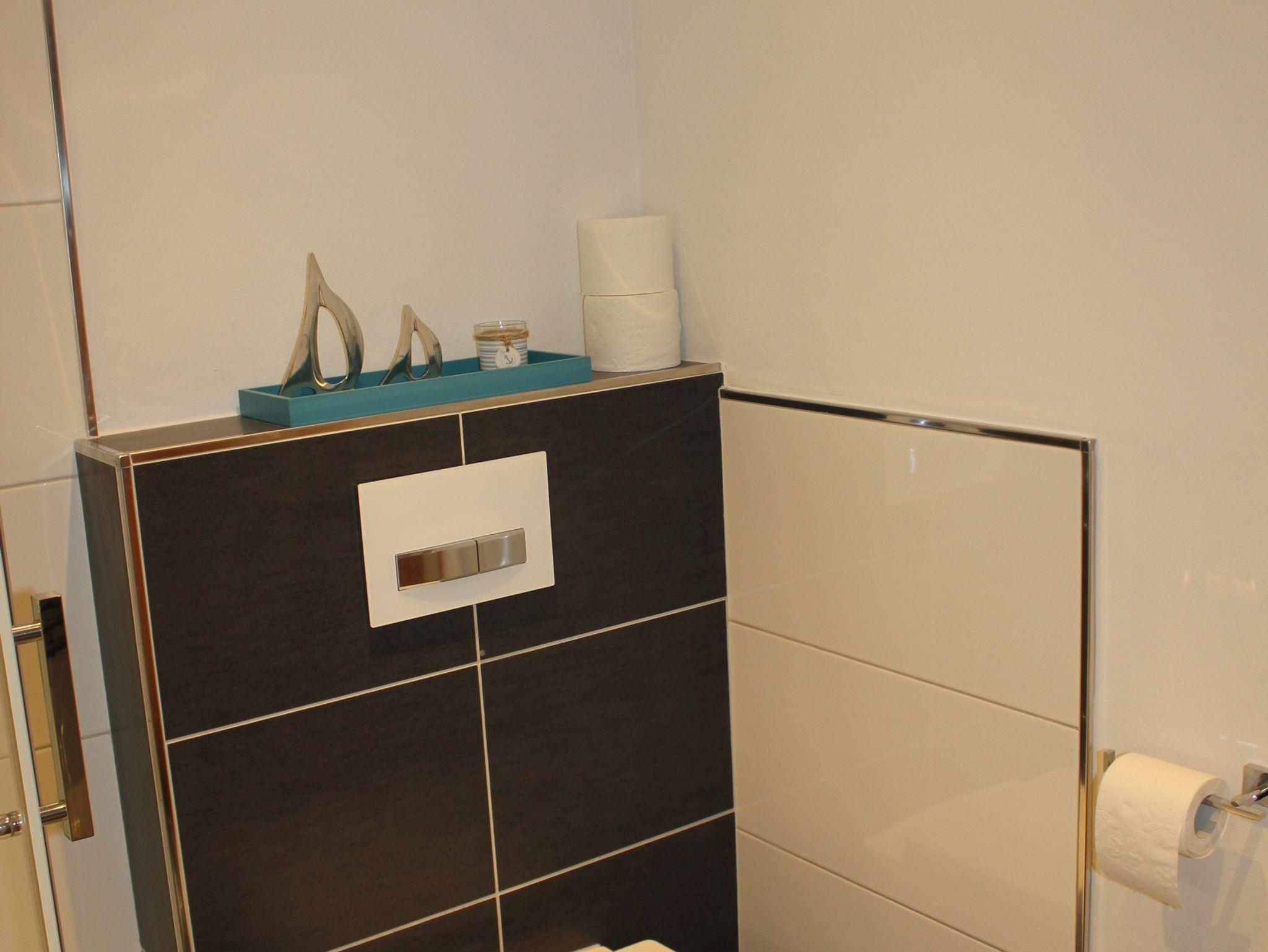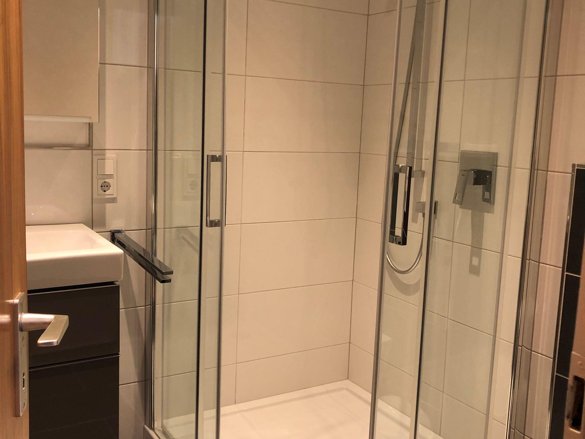 Im Badezimmer gibt es eine Dusche, ein Waschbecken und eine Toilette.