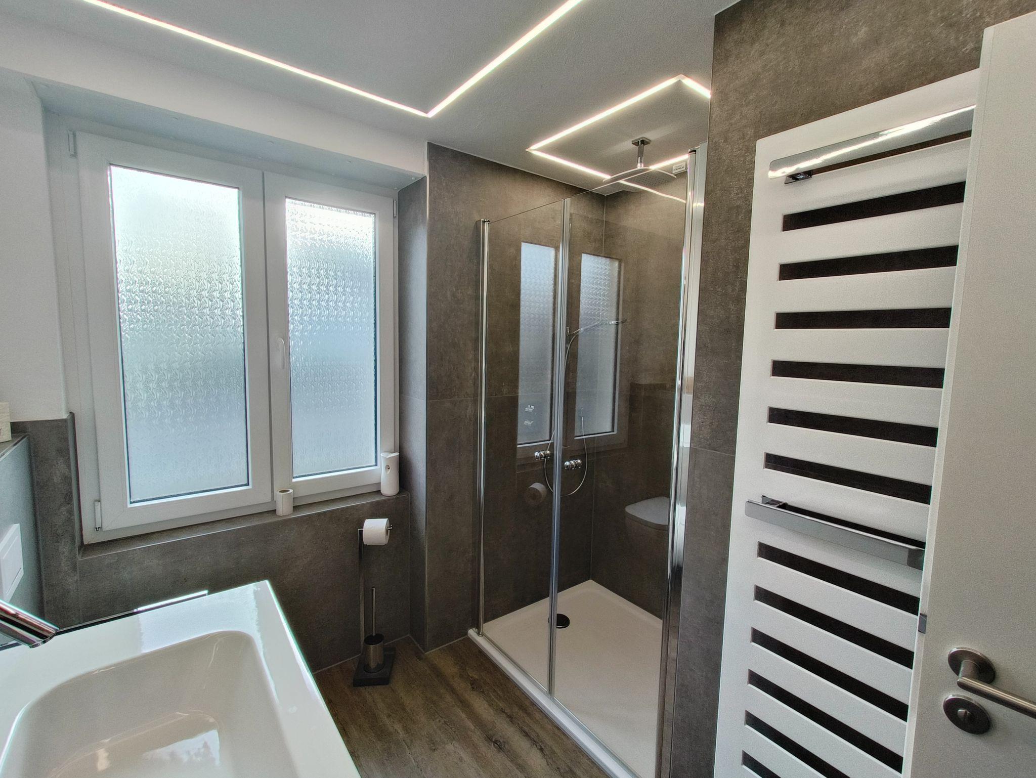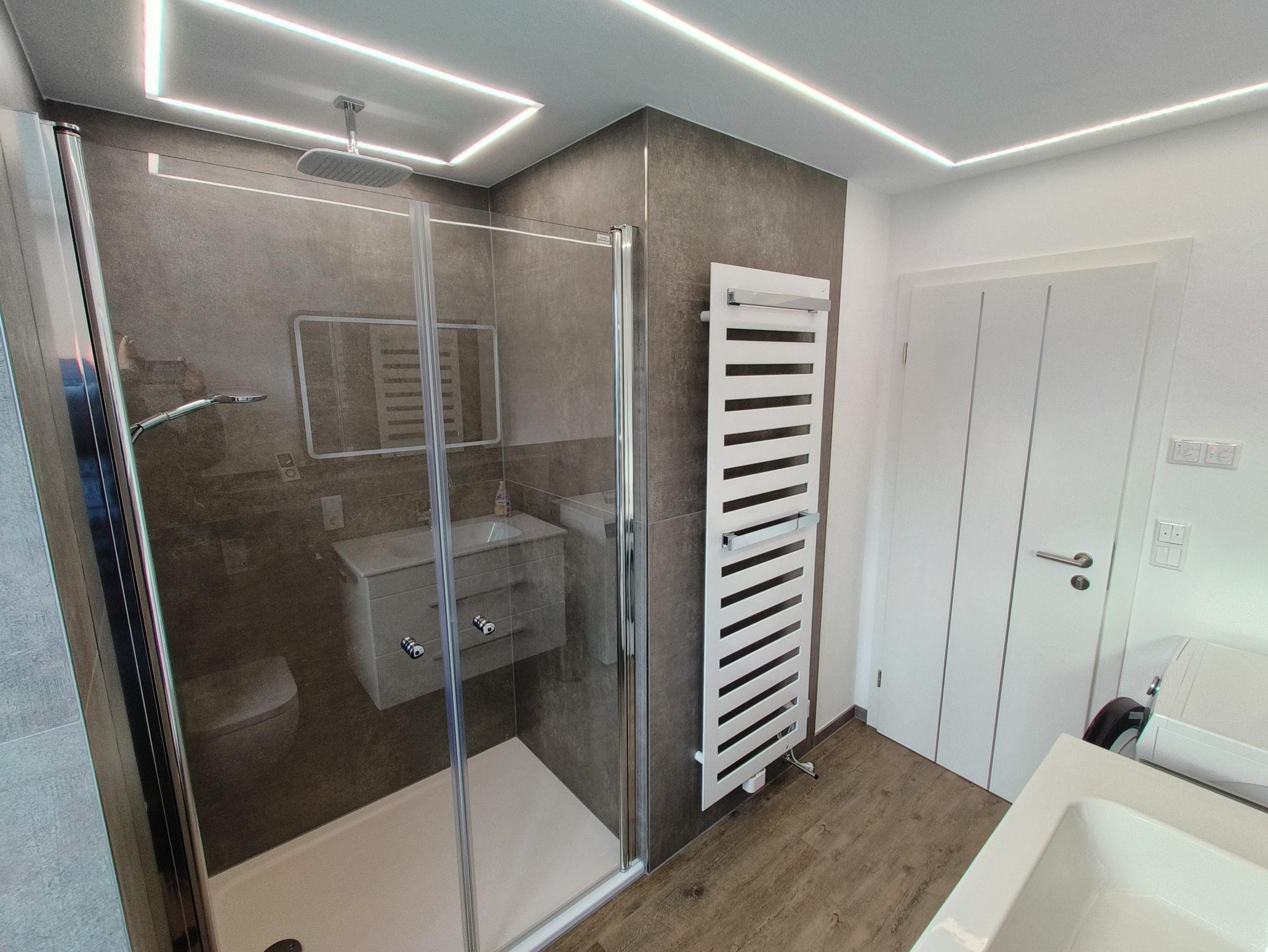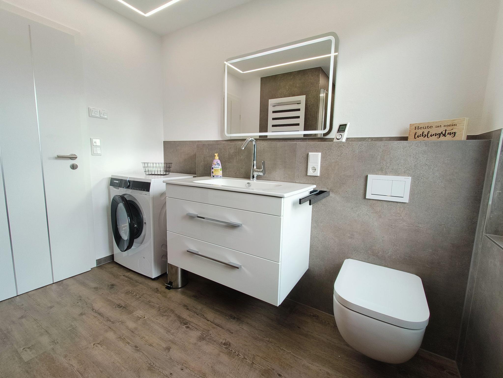 Im Bad genießt Ihr den bodenebenen großen Duschbereich mit Regenkopfbrause und die große Möbelwaschtischanlage mit vielen Ablagemöglichkeiten sowie Fußbodenheizung und zusätzlichen Handtuchtrockner. Die Waschmaschine befindet sich ebenfalls hier.