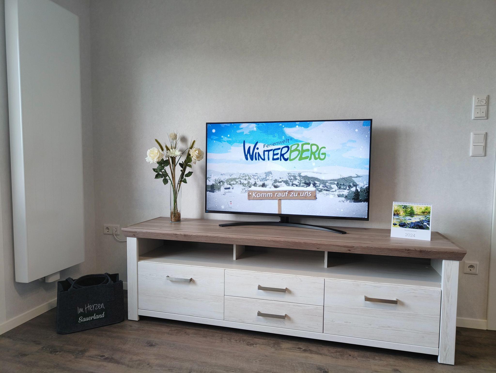 Wohnzimmer und großes Schlafzimmer verfügen jeweils über einen großen LED-Smart-TV (Schlafzimmer 43 Zoll und Wohnzimmer 50 Zoll Bildschirmdiagonale) mit Internetanbindung. In allen Räumen ist WLAN kostenfrei verfügbar.