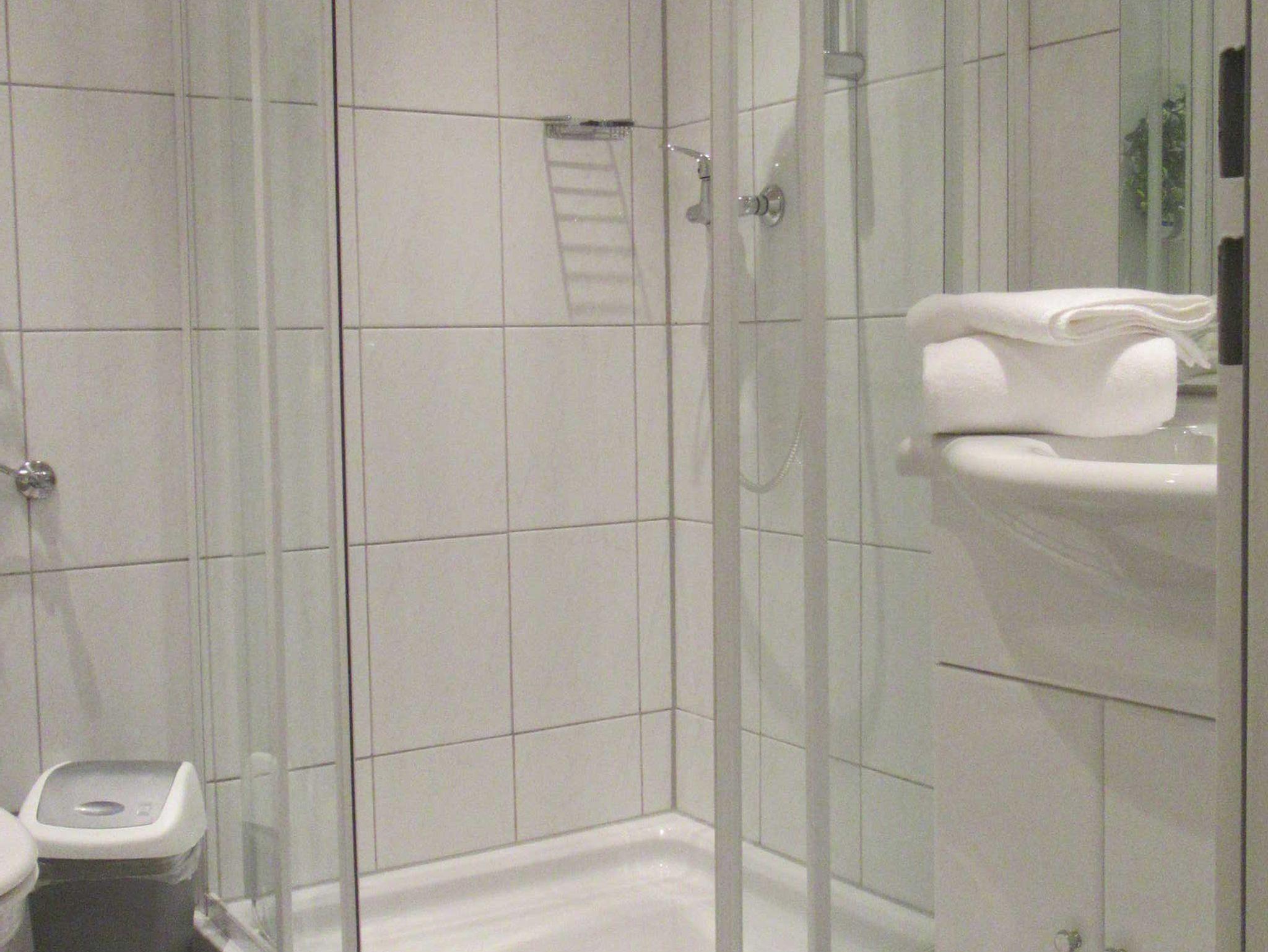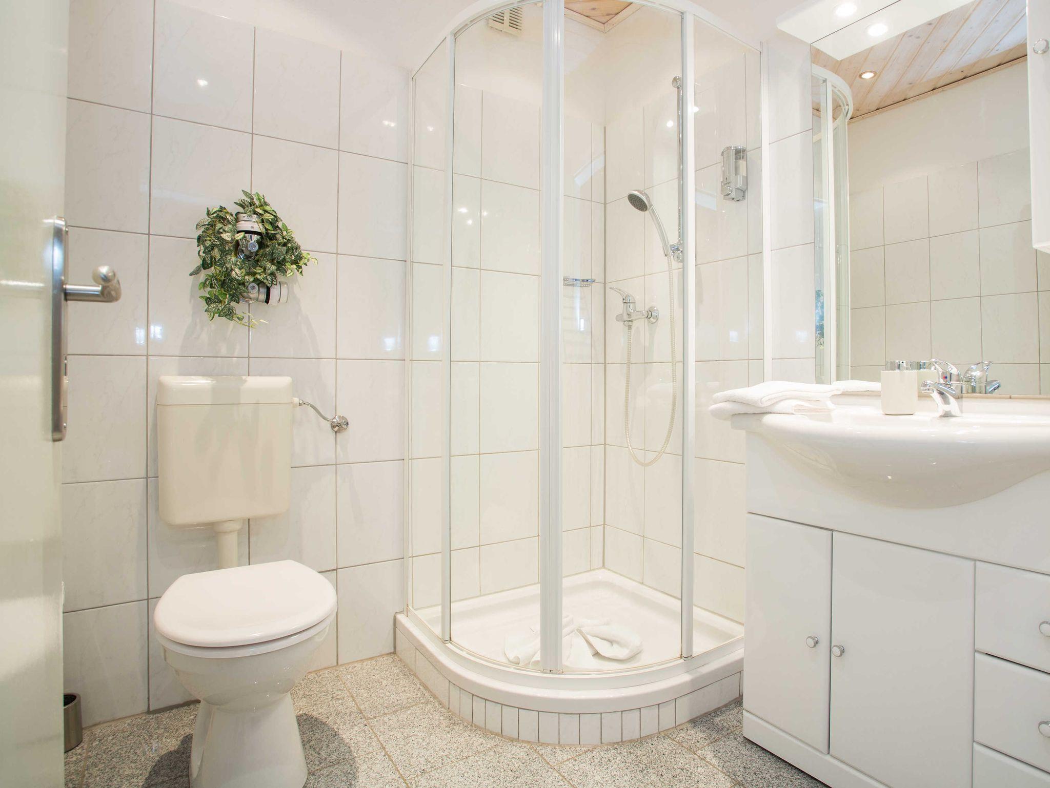 und ein modern eingerichtetes Bad mit Föhn.