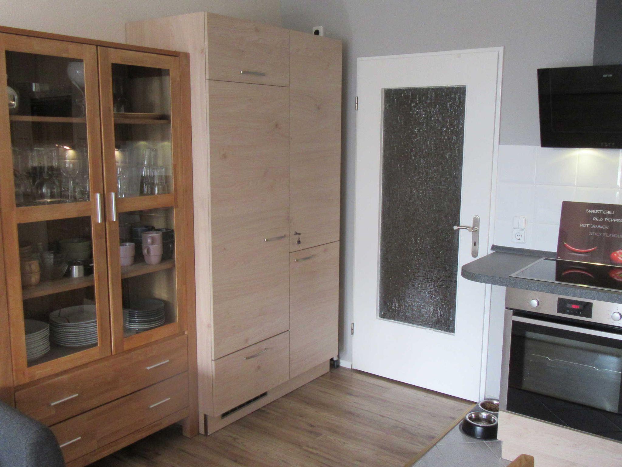 ausgestattete Küchenzeile mit Kühlschrank, Kochfeld, Backofen,