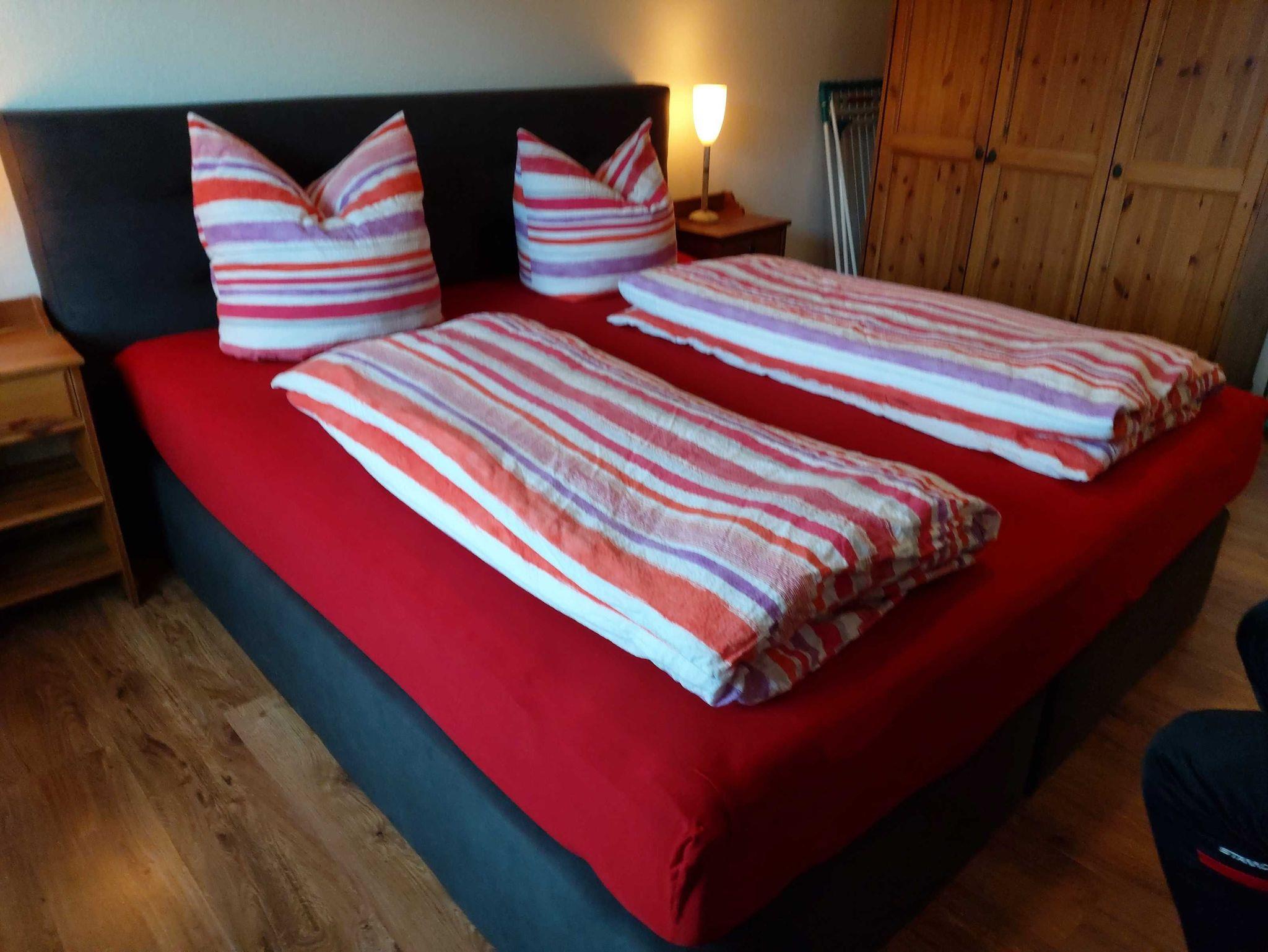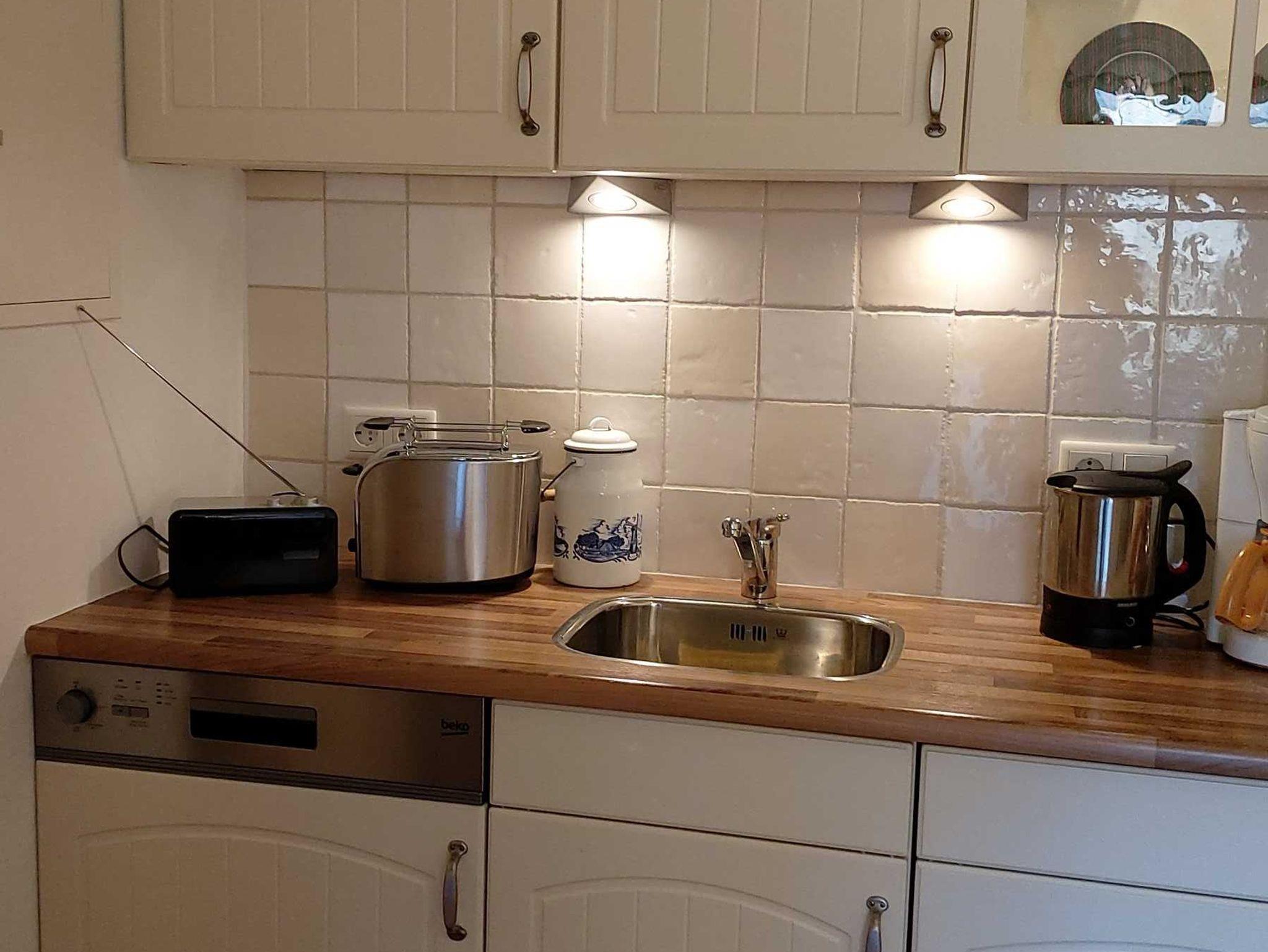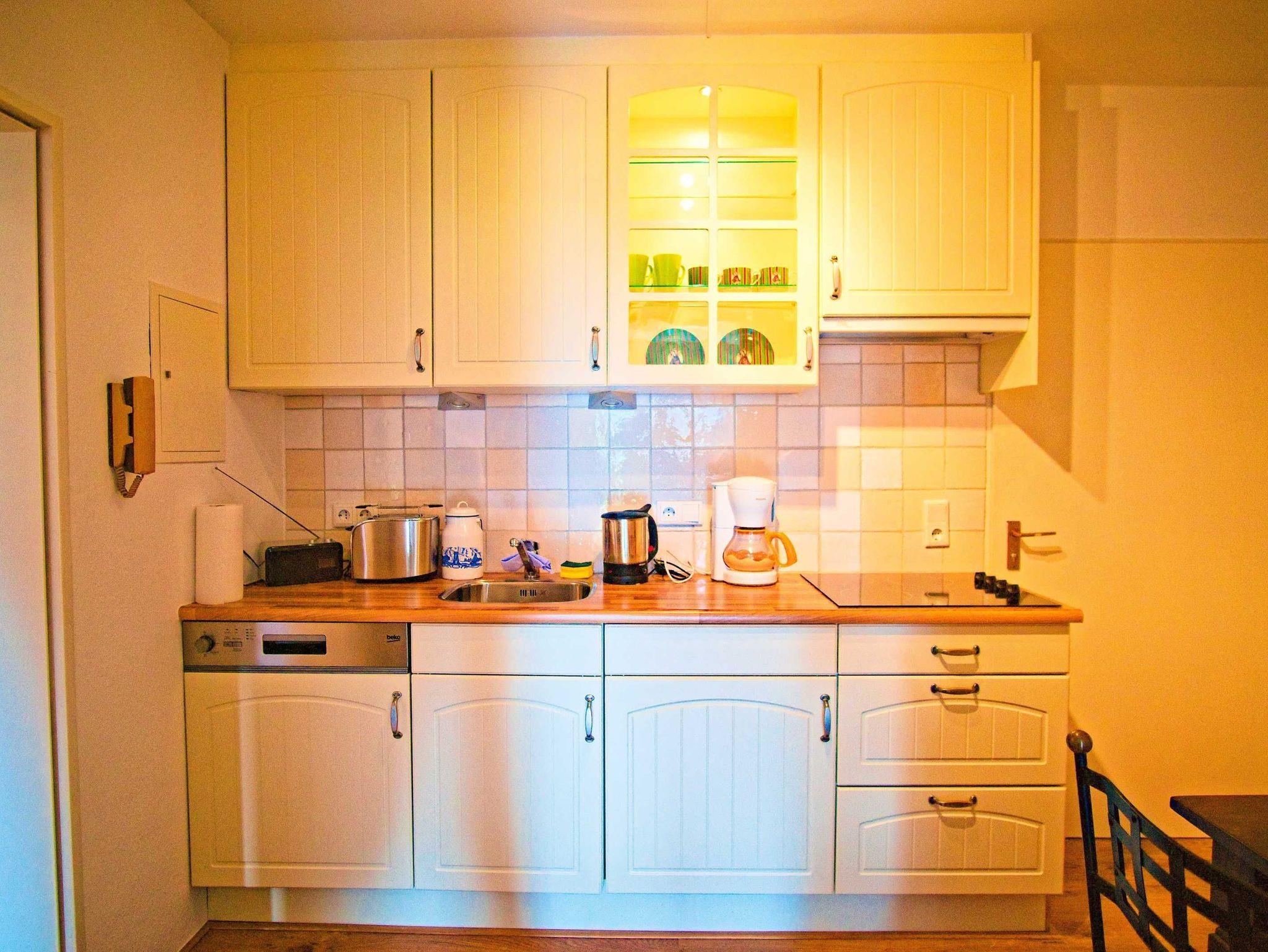 Küche mit Geschirrspüler, Kaffeemaschine, Mikrowelle, Wasserkocher, kostenloses Wlan uvm. Schlafzimmer mit Boxsprigbett. Terrasse mit großem Garten und Liegewiese.