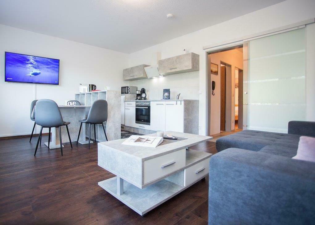 Das moderne Tageslichtbad ist mit einer bodentiefen Dusche ausgestattet. In der offenen Küche finden Sie alles was Sie für Ihren Urlaubsaufenthalt benötigen wie zum Beispiel Kaffeemaschine, Kapselkaffee Automat, Toaster, Mikrowelle, Wasserkocher, Luftfilter.